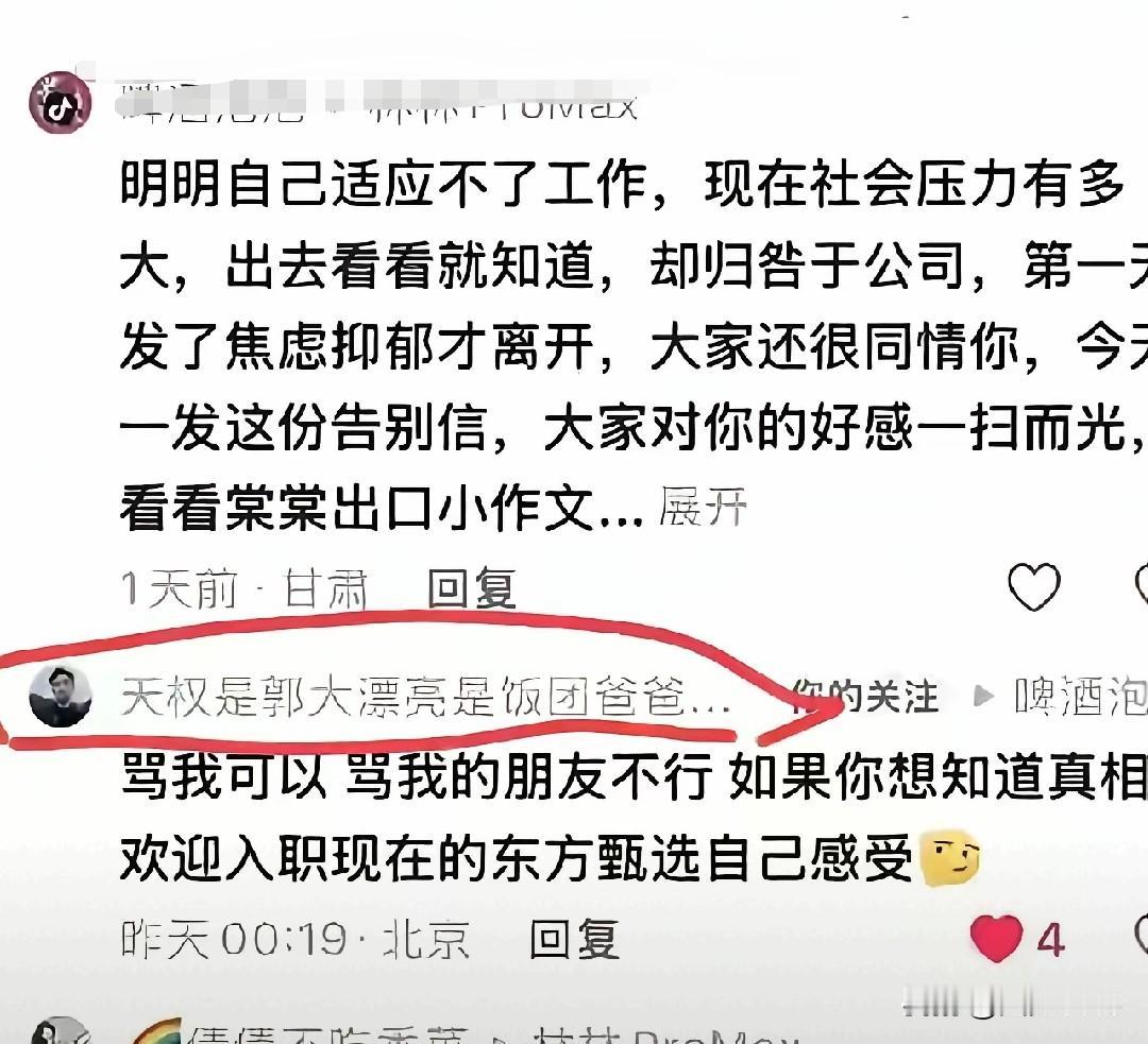 天权在林林的评论区里面维护林林弄怼粉丝。看来天权还是很年轻,什么话都敢说。或许他们在新的领导下不适应,但是职场就是这样。给别人打工就得看别人脸色,遵守别人的规则,不适应你可以离开。因为职场就是铁打的营盘流水的兵。
