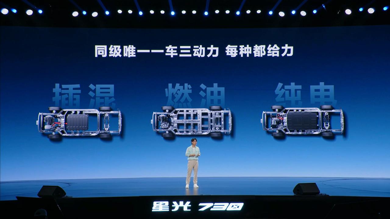 燃油、插混、纯电三种动力可选,燃油版1.5T发动机,峰值扭矩290N·m;插混版综合续航1100km,百公里亏电油耗5.3L,纯电续航125km;纯电版续航500km,2C快充。