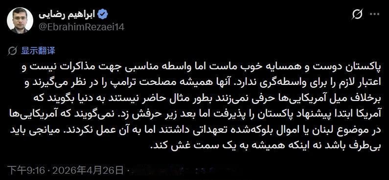 “巴基斯坦是我们友好而良好的邻国,但它不是进行谈判的合适中间人,也没有充当中间人的必要信誉。他们总是考虑特朗普的利益,不会违背美国人的意愿说一句话。例如,他们不愿向世界宣告,美国最初接受了巴基斯坦的提议,但后来却食言而肥。他们不说美国人在黎巴嫩问题或被冻结资产上负有承诺,但并未兑现。中间人必须保持中立,而不是总是偏向一方。”