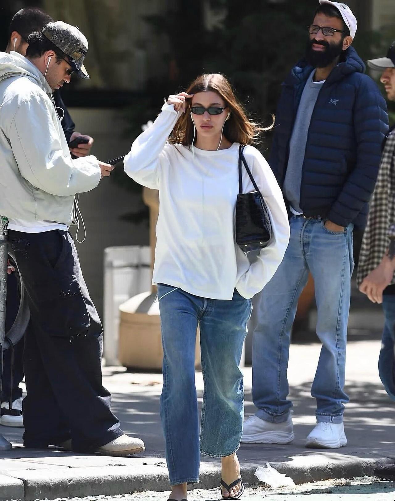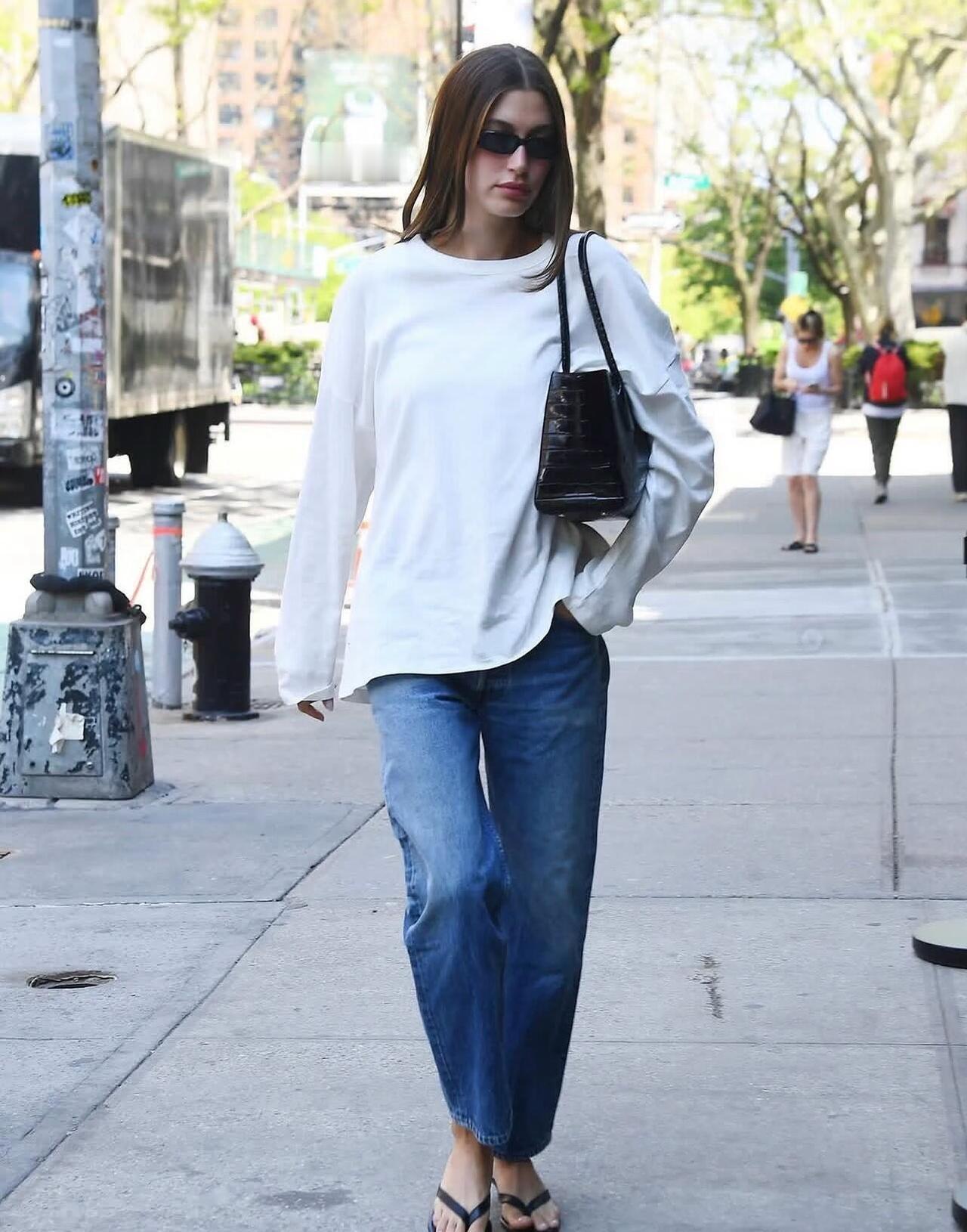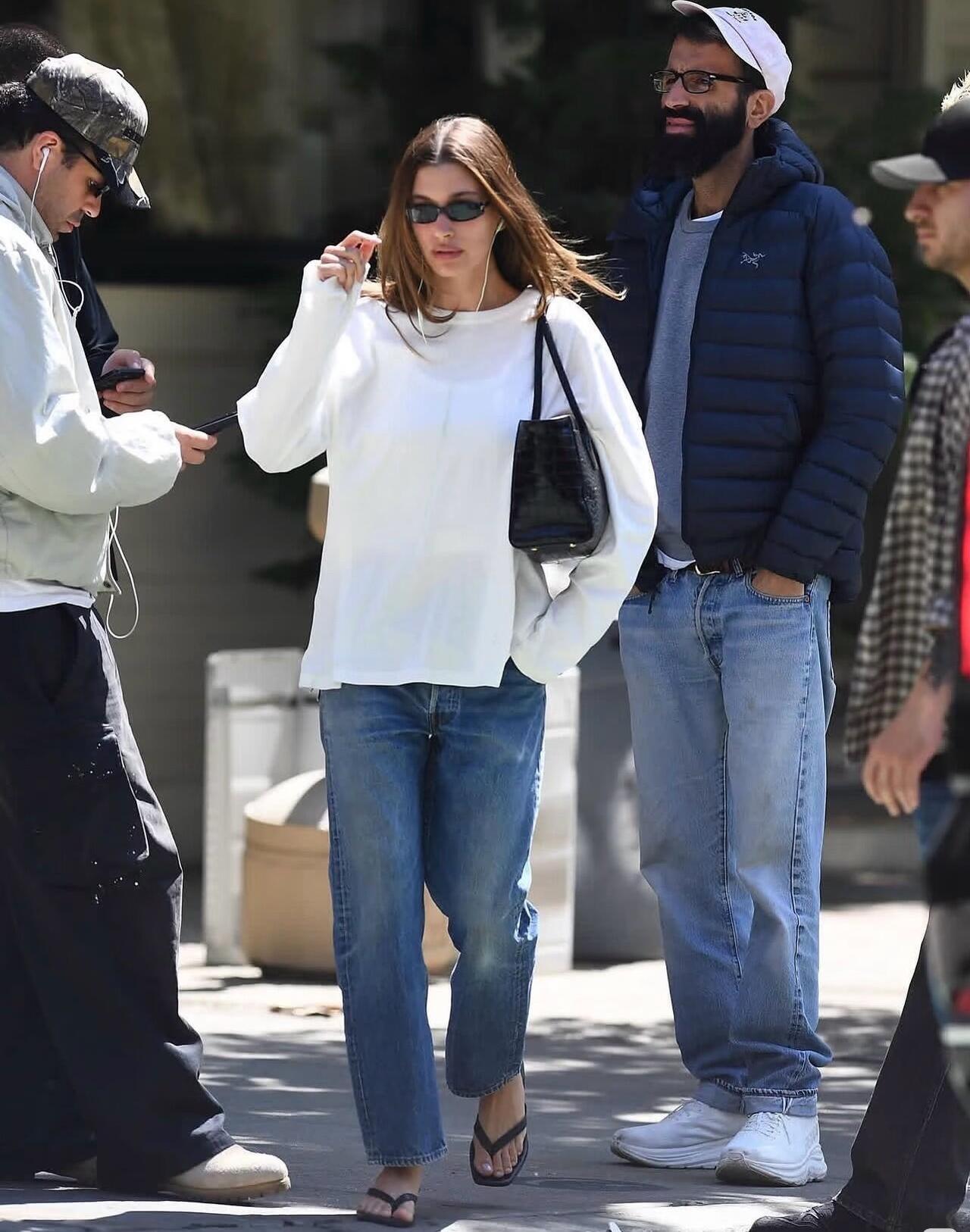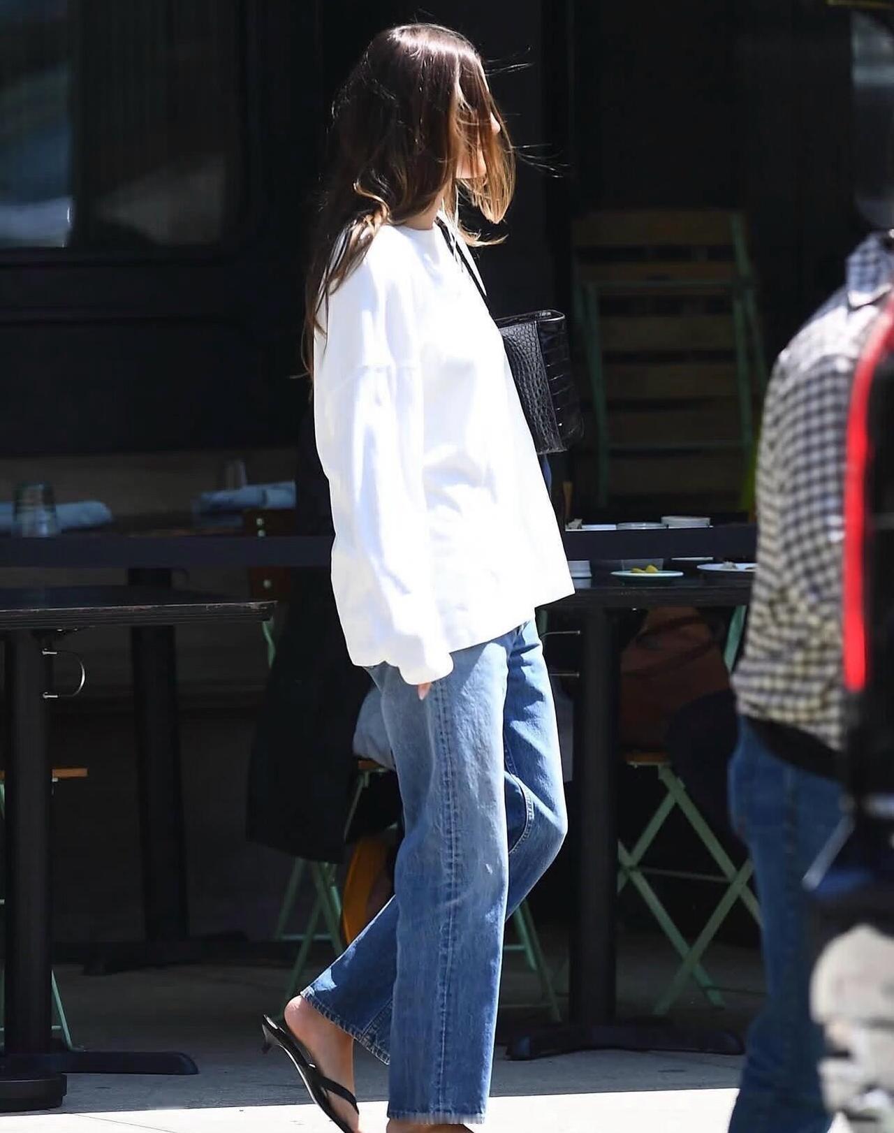 Hailey Bieber街拍,白T恤配牛仔裤很清爽减龄!宽松白T搭配直筒水洗牛仔裤,版型利落又藏肉,不费力就穿出随性松弛感。踩一双人字拖、挎上黑包,再用墨镜点缀,简单的基础款组合,把美式街头的慵懒时髦拿捏得刚刚好,清爽又耐看,日常出门照着穿也完全不踩雷。