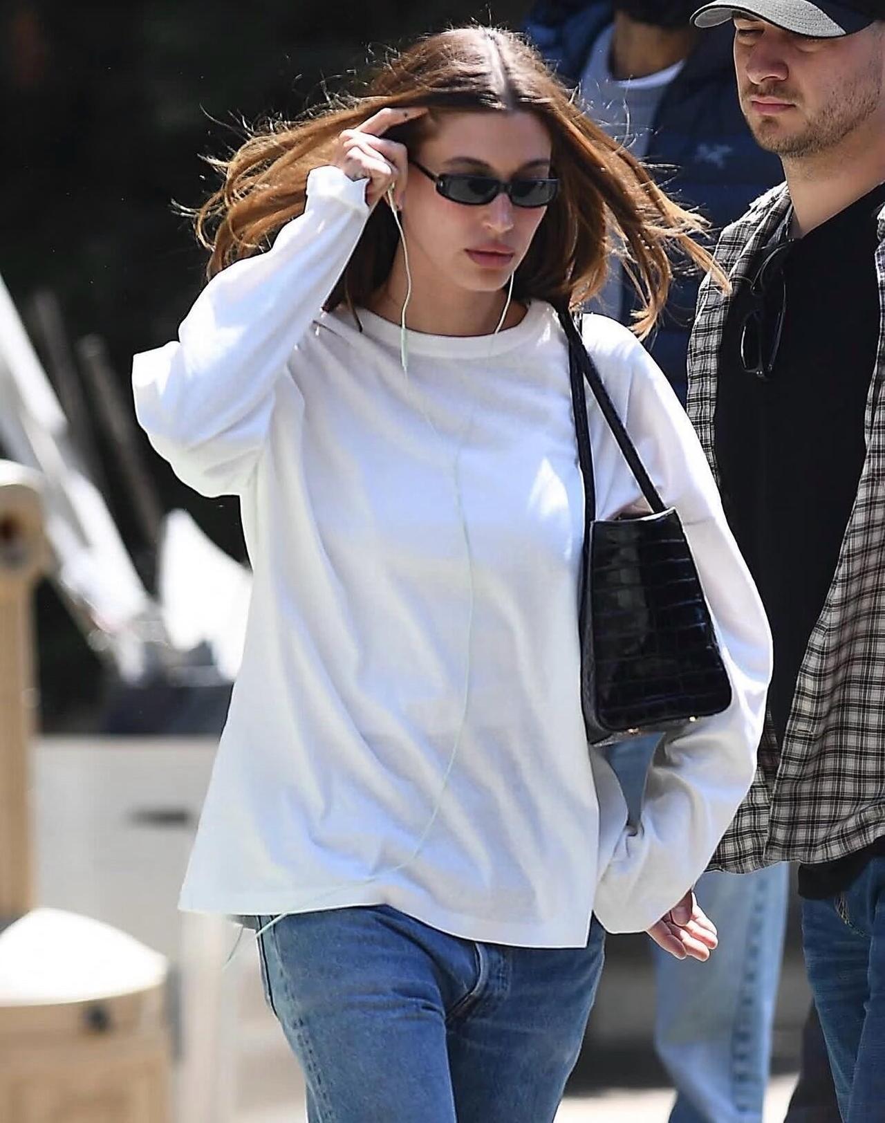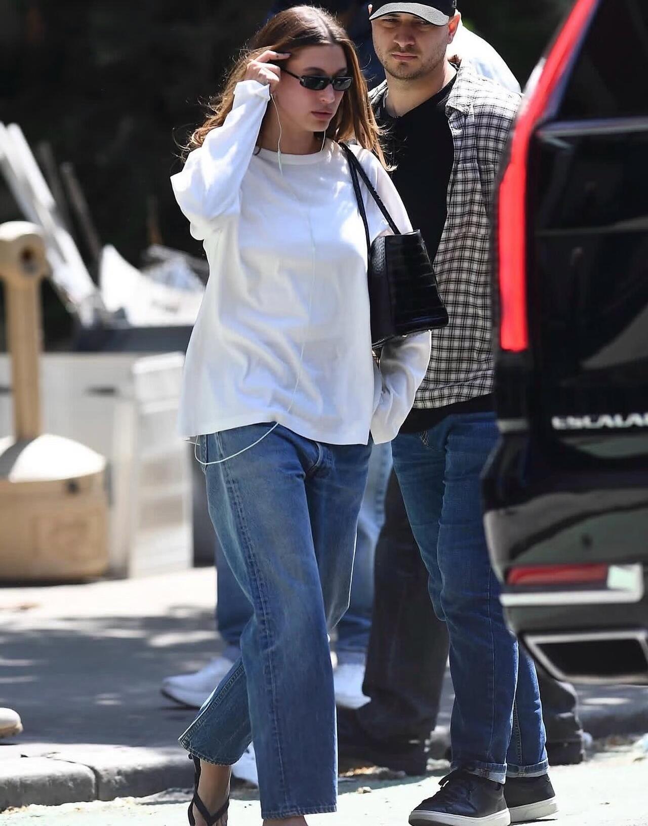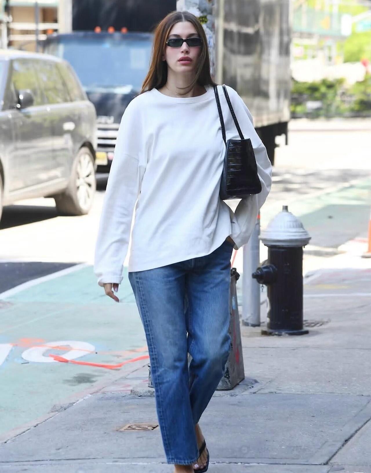 Hailey Bieber街拍,白T恤配牛仔裤很清爽减龄!宽松白T搭配直筒水洗牛