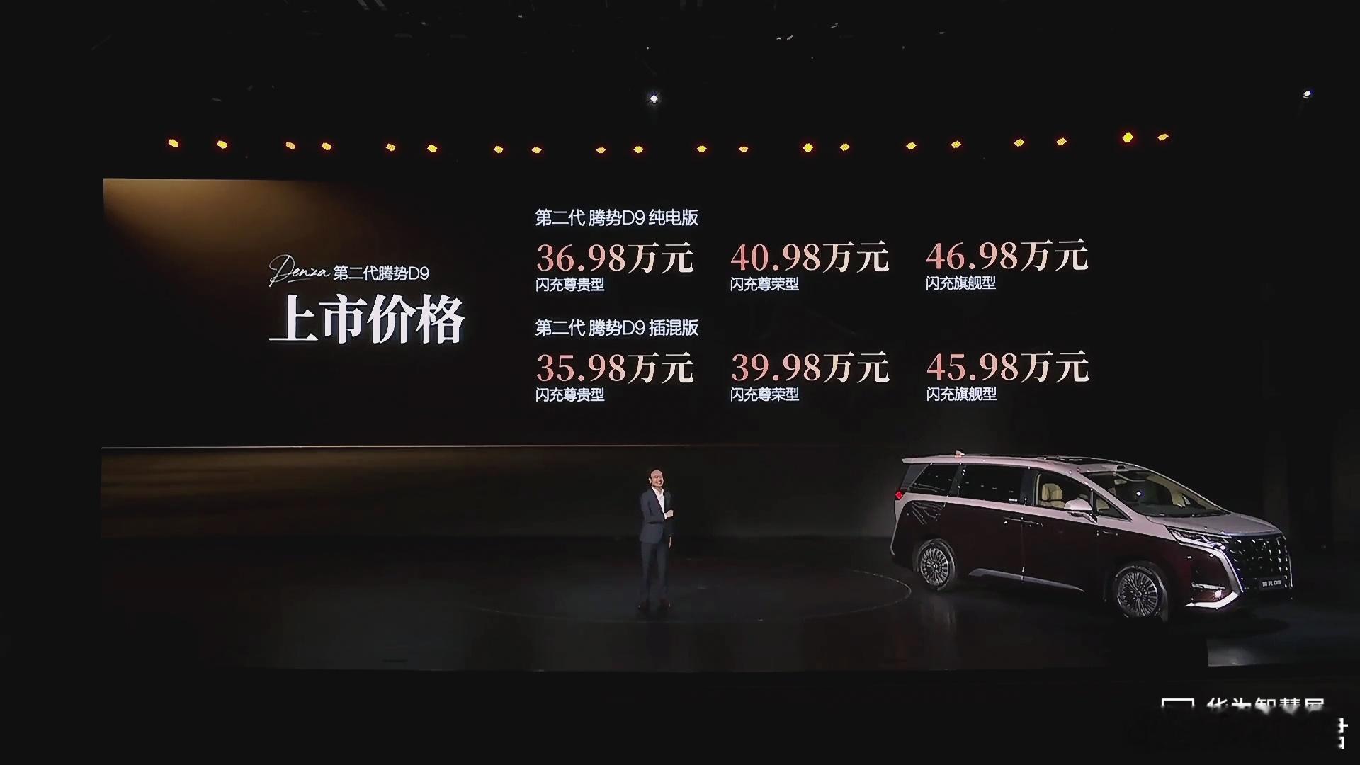 第二代腾势D9正式上市,九大全面迭代升级,豪华MPV再上新台阶,给大伙简单汇总一下~-第二代腾势D9插混版:35.98万/39.98万/45.98万元-第二代腾势D9纯电版:36.98万/40.98万/46.98万元纯电版本CLTC续航800km,插混版本纯电续航401km;5分钟充电10%-70%,9分钟充至97%,零下30℃充电效率依旧在线,赠送一年免费闪充权益。首搭百万豪车同款双阀云辇-C双阀减震器,配备智能定眩防晕车系统,刷新豪华MPV驾乘舒适新水平。全球首创合元超集成动力平台,882L超大后备箱空间,7人满载仍可放下12个行李箱,储物能力拉满。全系标配天神之眼5.0智驾系统,搭载激光雷达+4D毫米波雷达,支持城市全场景领航;标配9个安全气囊+笼式车身,多项超高时速AEB紧急制动,安全性能同级领先。产品力全方位升级,商务家用两不误,更年轻更豪华。这价格还满意吗?