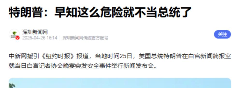 2026年4月25日,华盛顿希尔顿酒店的宴会厅里,白宫记者协会的年度晚宴正热闹非凡。谁也没想到,一声突如其来的枪响,让这场本该充满笑声的聚会瞬间变成"逃生现场",美国总统特朗普和夫人梅拉尼娅被特勤局特工拽着胳膊狂奔撤离,事后特朗普拍着胸口表示:早知道当总统这么玩命,当初打死我也不选!