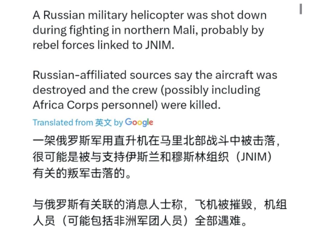 俄罗斯自2022年接棒法国在马里的军事存在后,靠着2000来号非洲军团人员搞"安全换资源",用军事保护换取马里铀矿、金矿开采权,但这次事件戳破了三个致命问题: