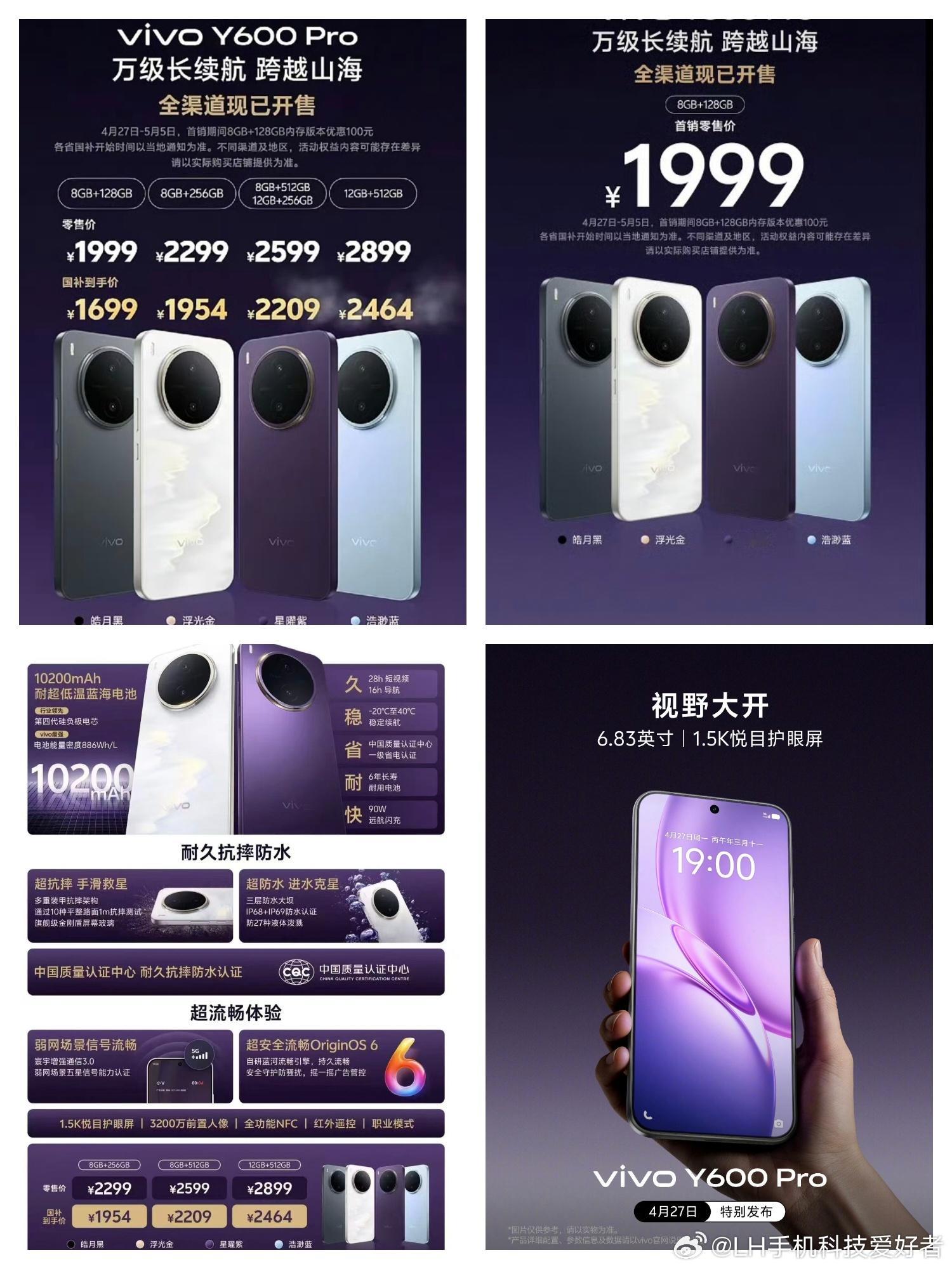vivo Y600 Pro发布,10200毫安电池,90W快充,联发科天玑7300e芯片,首销售价1999元起,起步8GB+128GB内存规格。