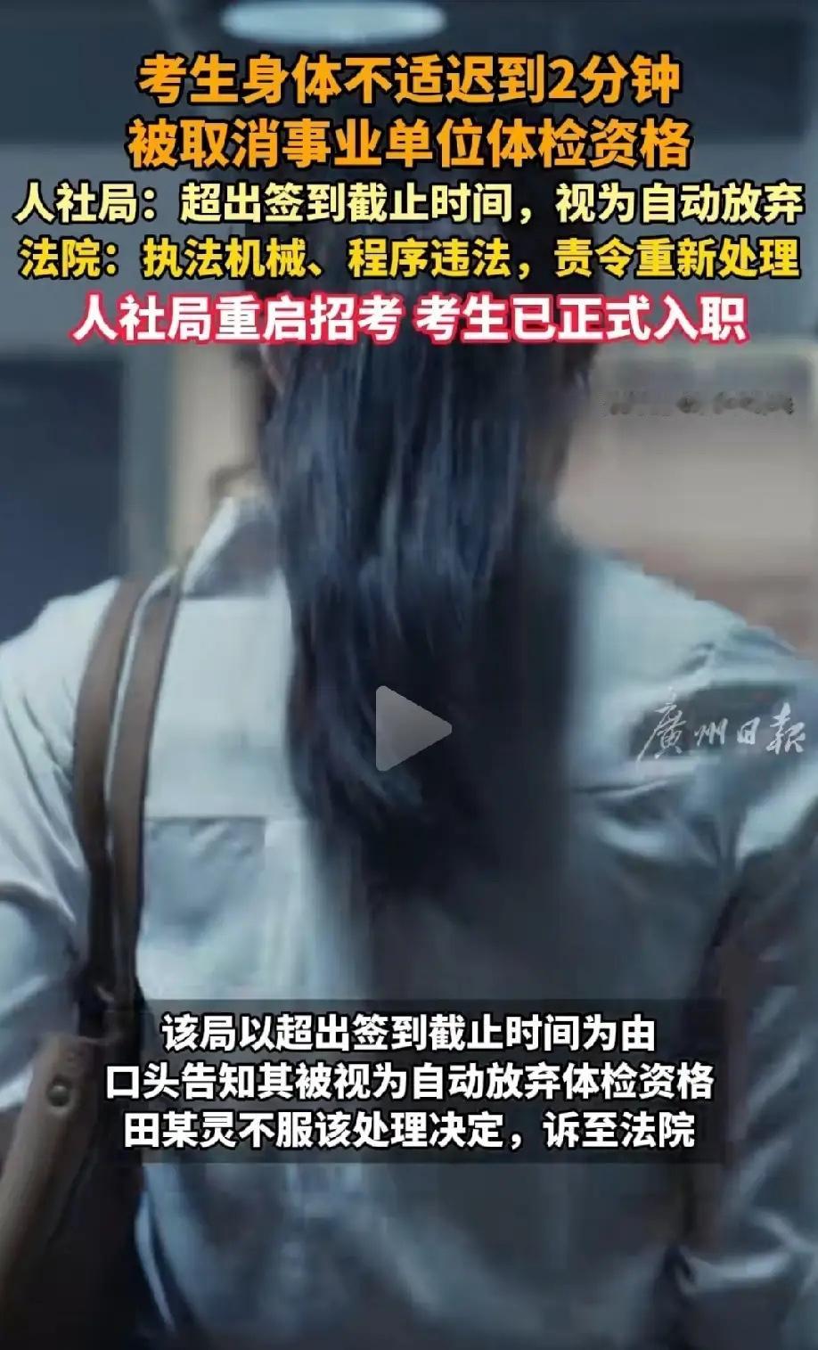 法院直接怼了人社局,这又不是多大的错,至于直接取消资格吗?田某灵因为看病就迟到了两分钟,这完全情有可原,也没扰乱体检秩序,直接一棍子打死,取消资格,这处罚太重了,太不近人情。换作是你,苦读几年就因为2分钟被拒,能甘心吗?规则是死的,人是活的!