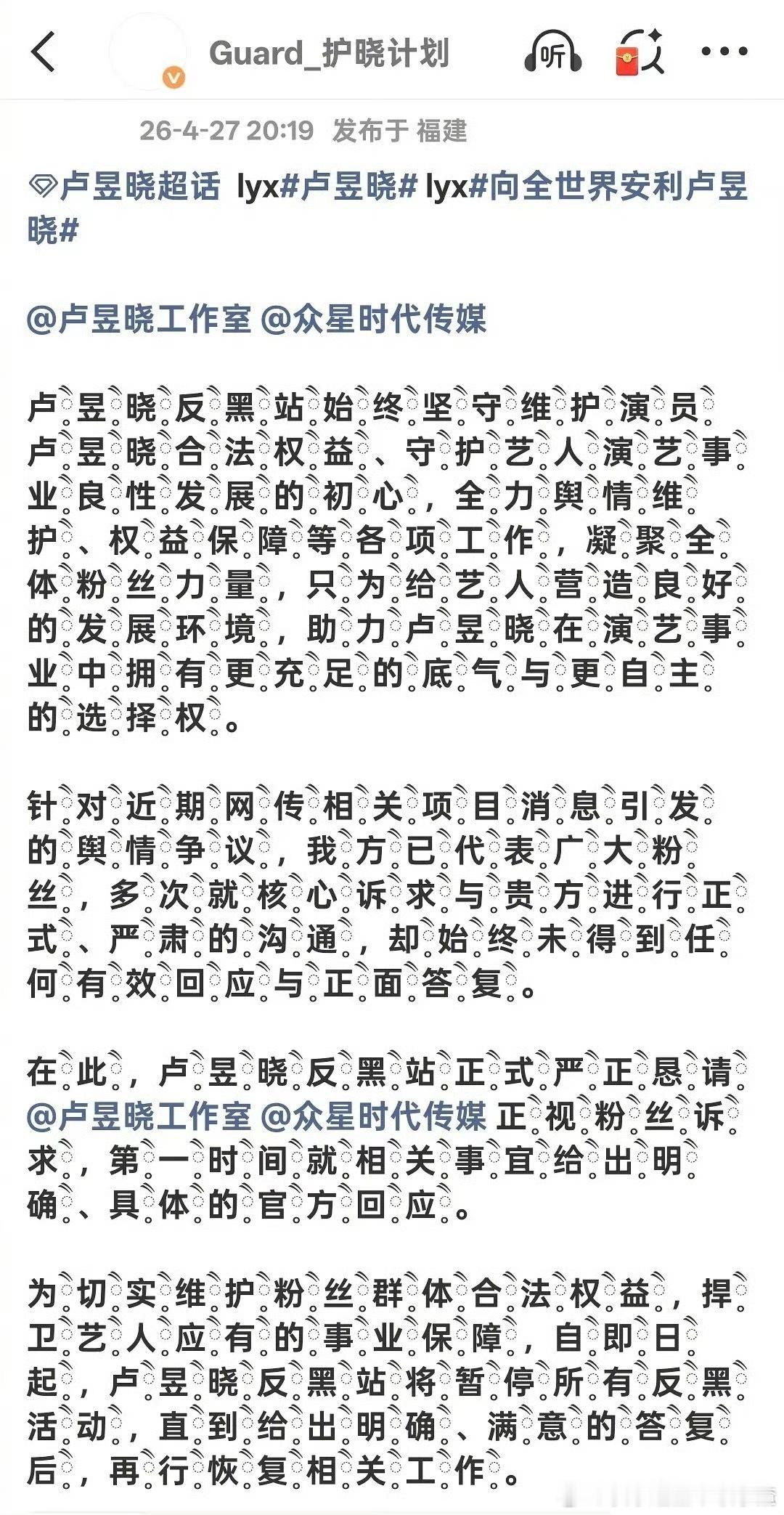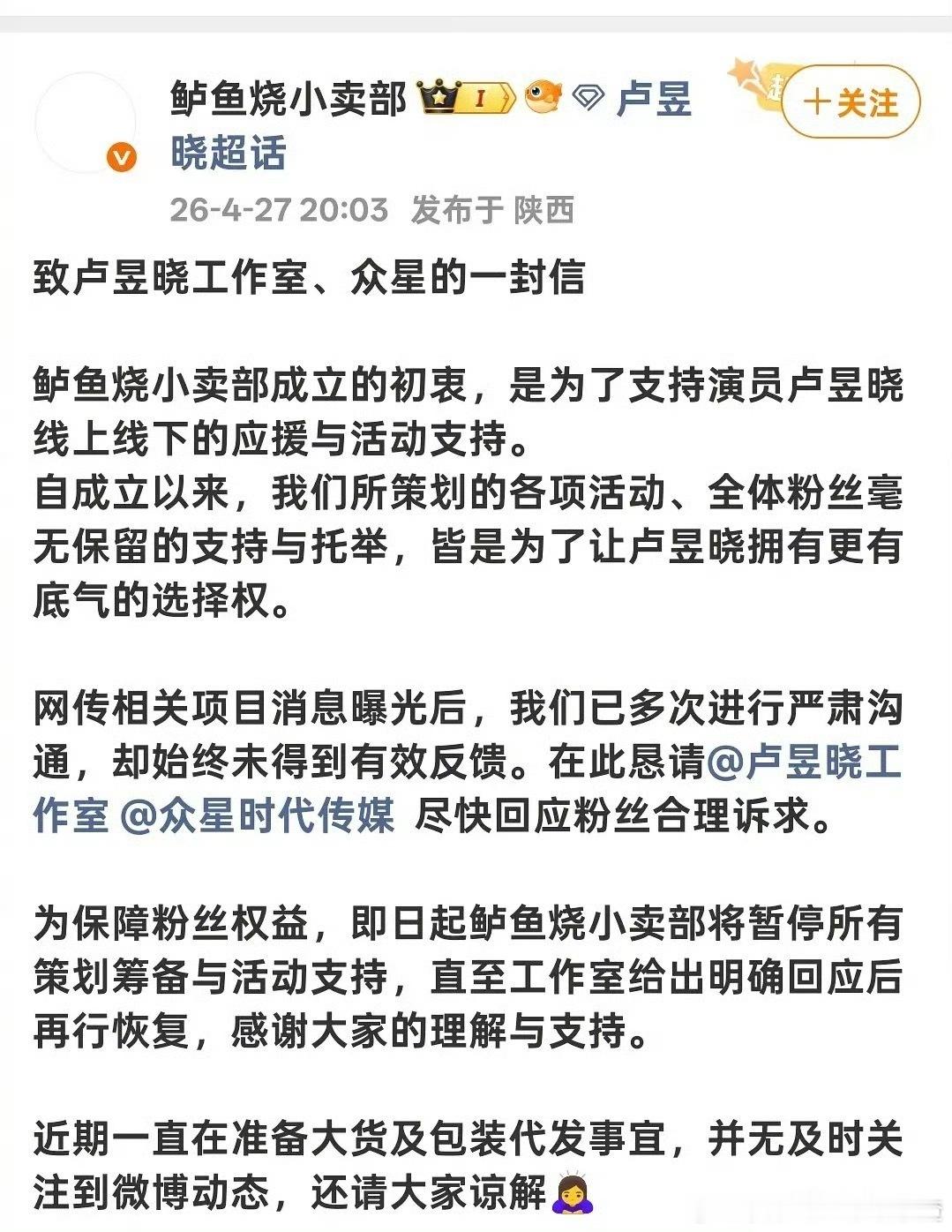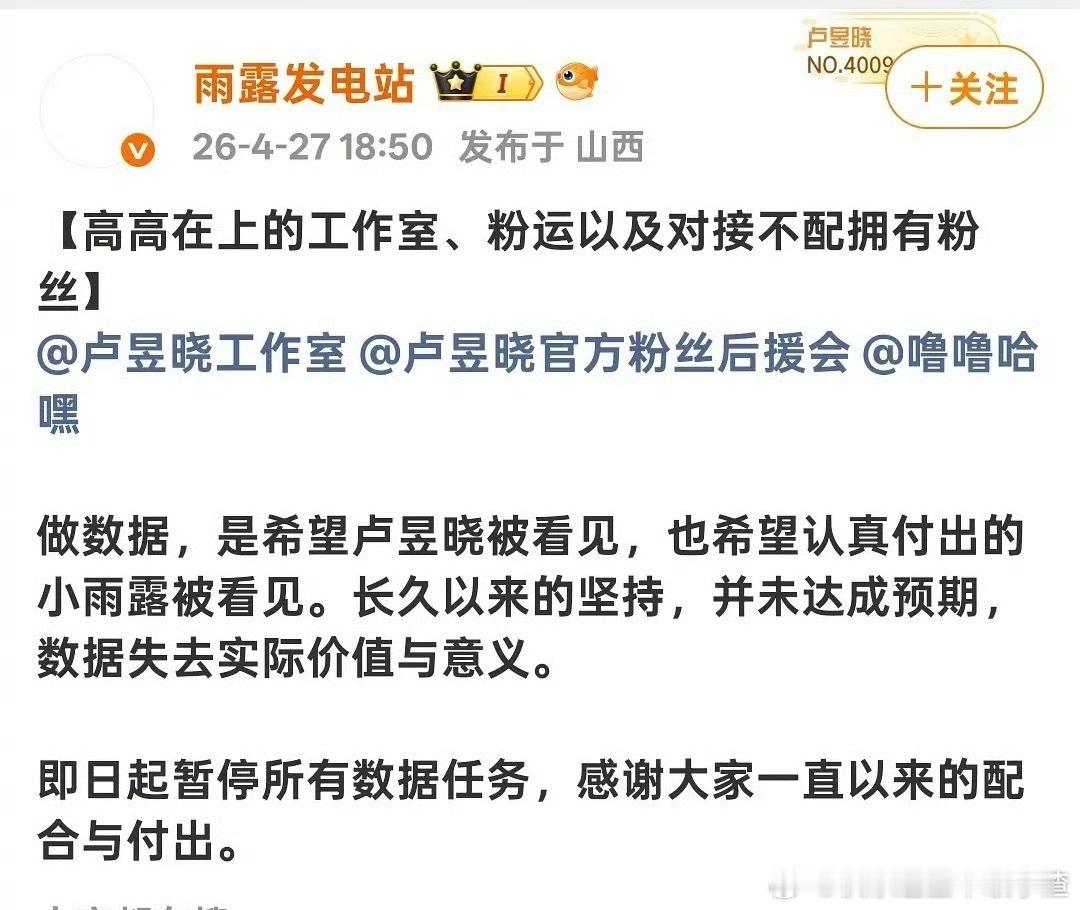 卢昱晓粉丝不接受对接回应拍恰逢雨连天,各职能站开始罢工维权,超话主持也白头像了。