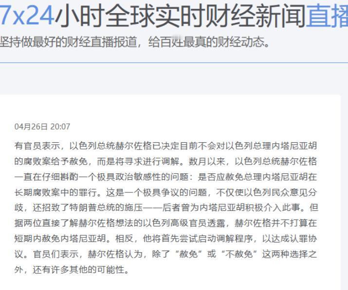 4月26日,以色列总统赫尔佐格给总理内塔尼亚胡的腐败案来了招“四两拨千斤”——既不赦免也不定罪,而是启动调解程序,争取让内塔尼亚胡达成认罪协议。这手“第三条路”的棋,既避开了“司法不公”的骂名,又给内塔尼亚胡留了“体面退场”的台阶,堪称以色列政坛的“平衡术”典范。