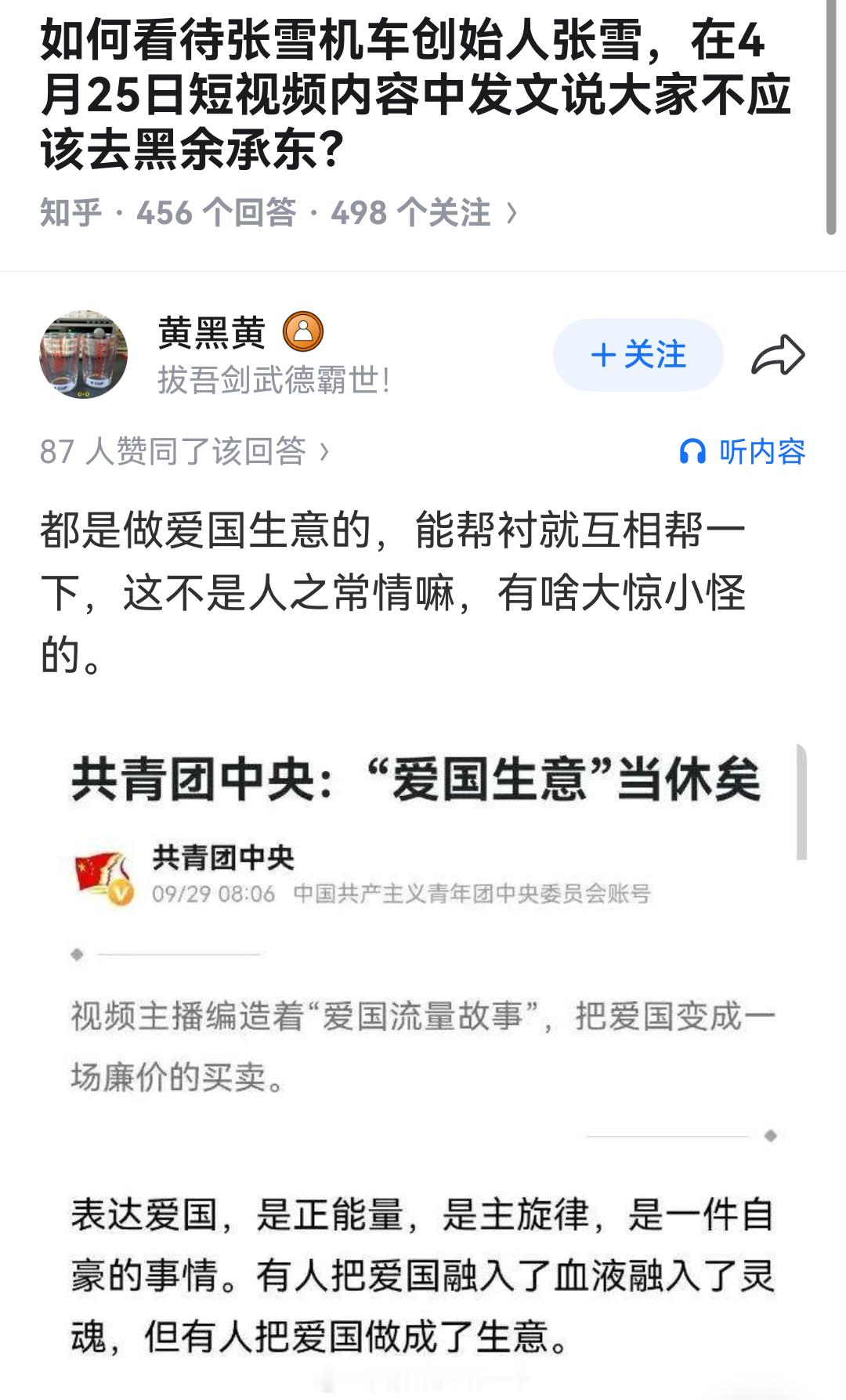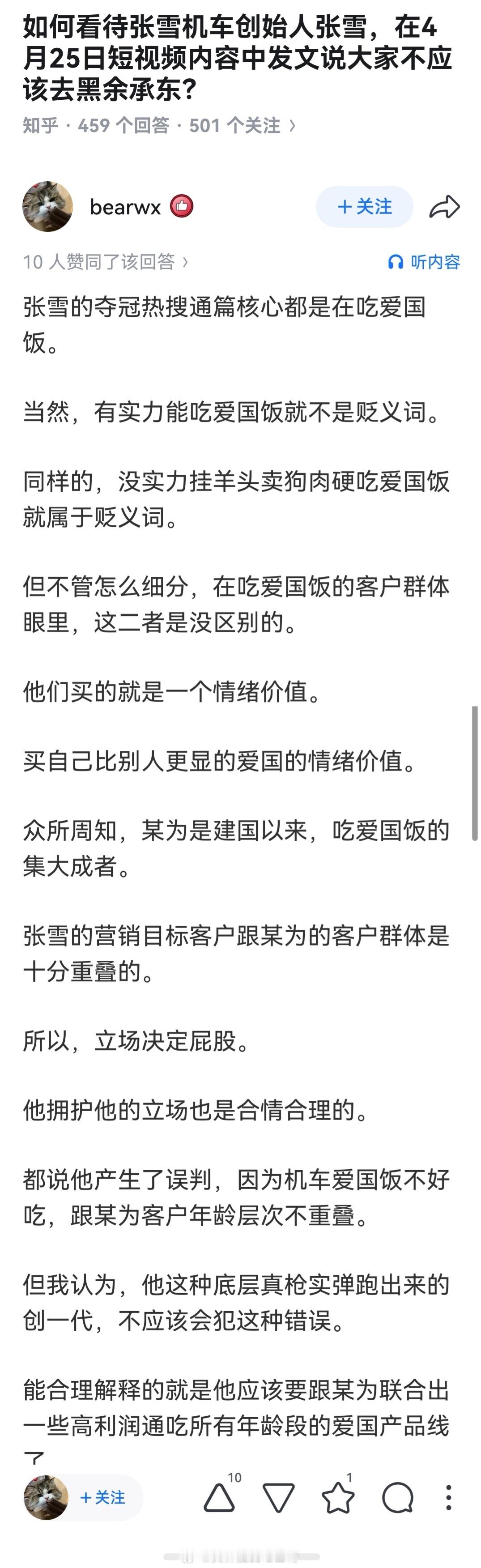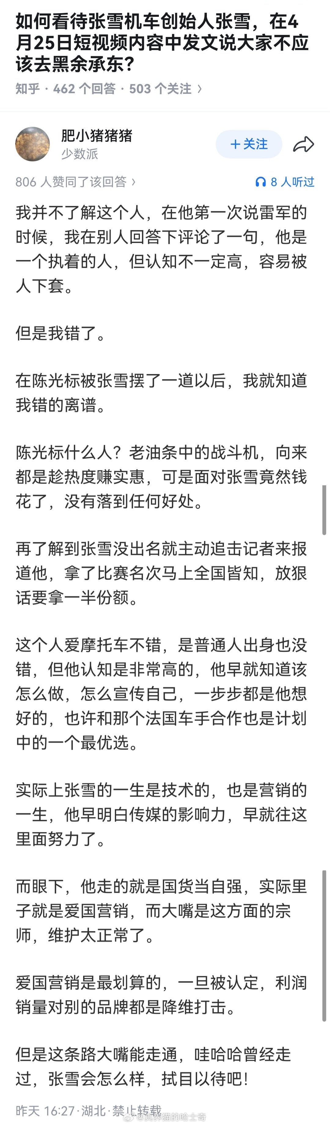 张雪只是简单的说了句不应该拿喝水的事儿攻击余承东,现在已经被打成爱国营销了。张雪