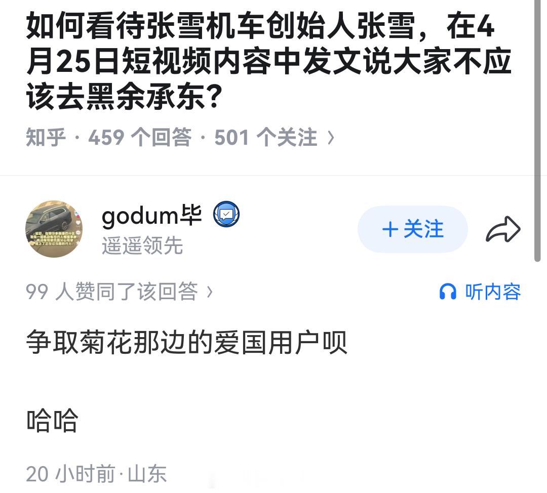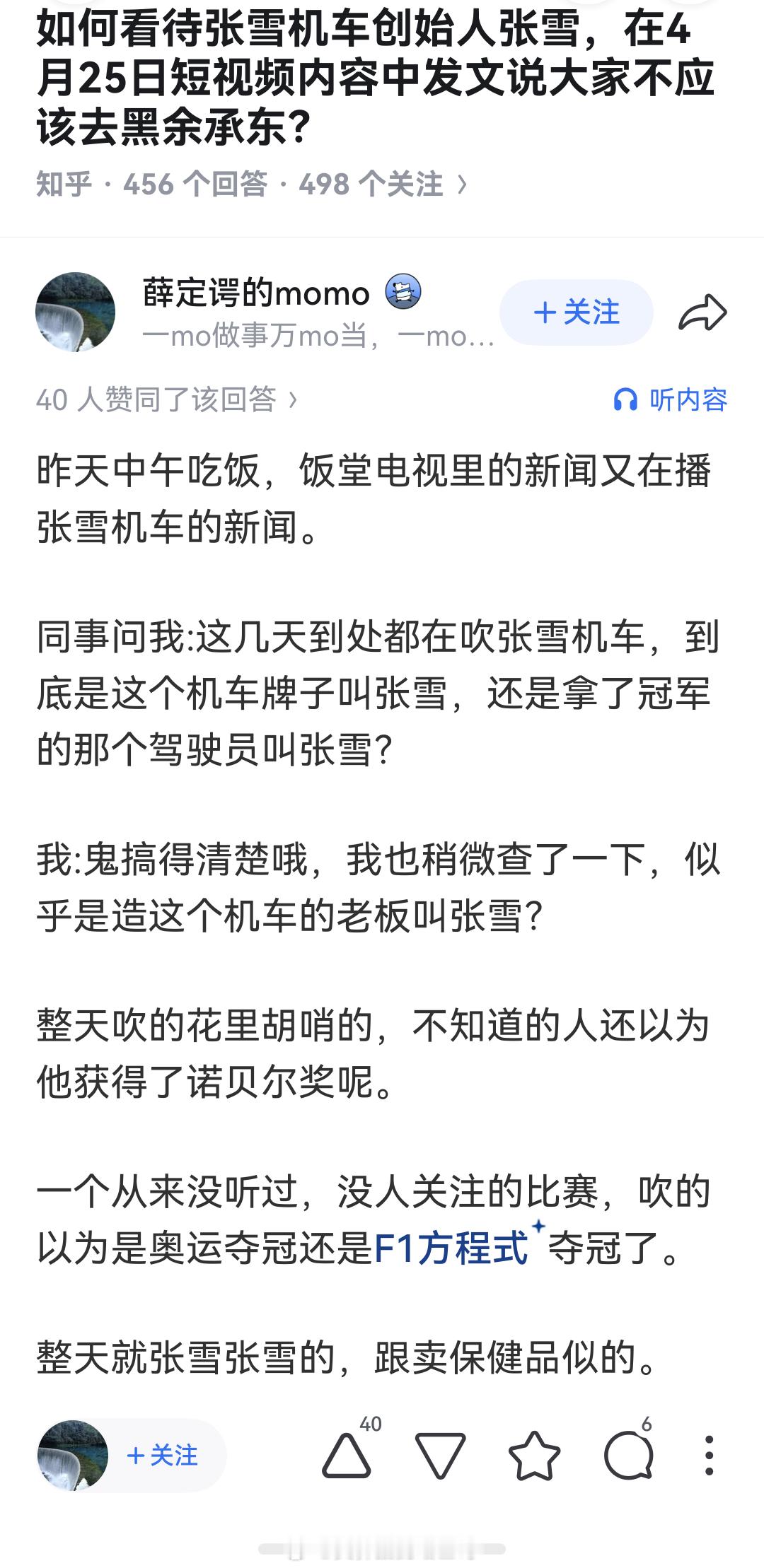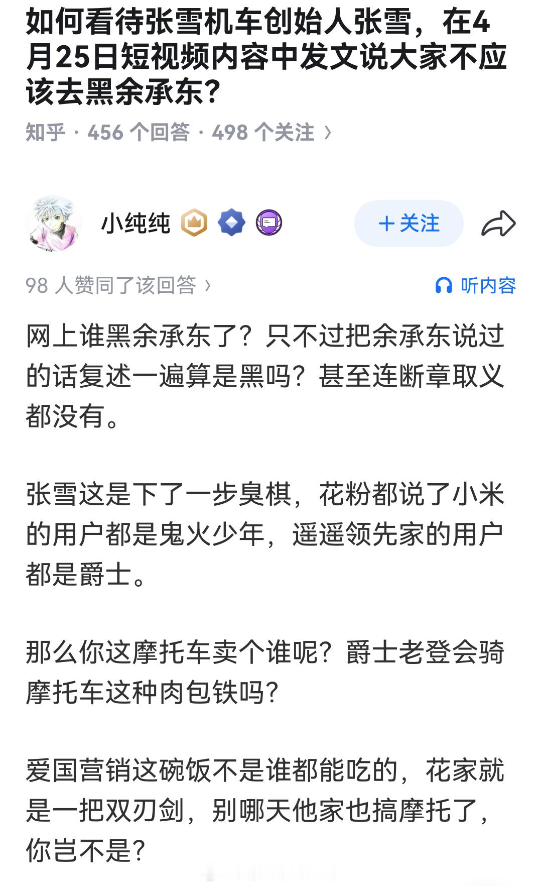 张雪只是简单的说了句不应该拿喝水的事儿攻击余承东,现在已经被打成爱国营销了。张雪