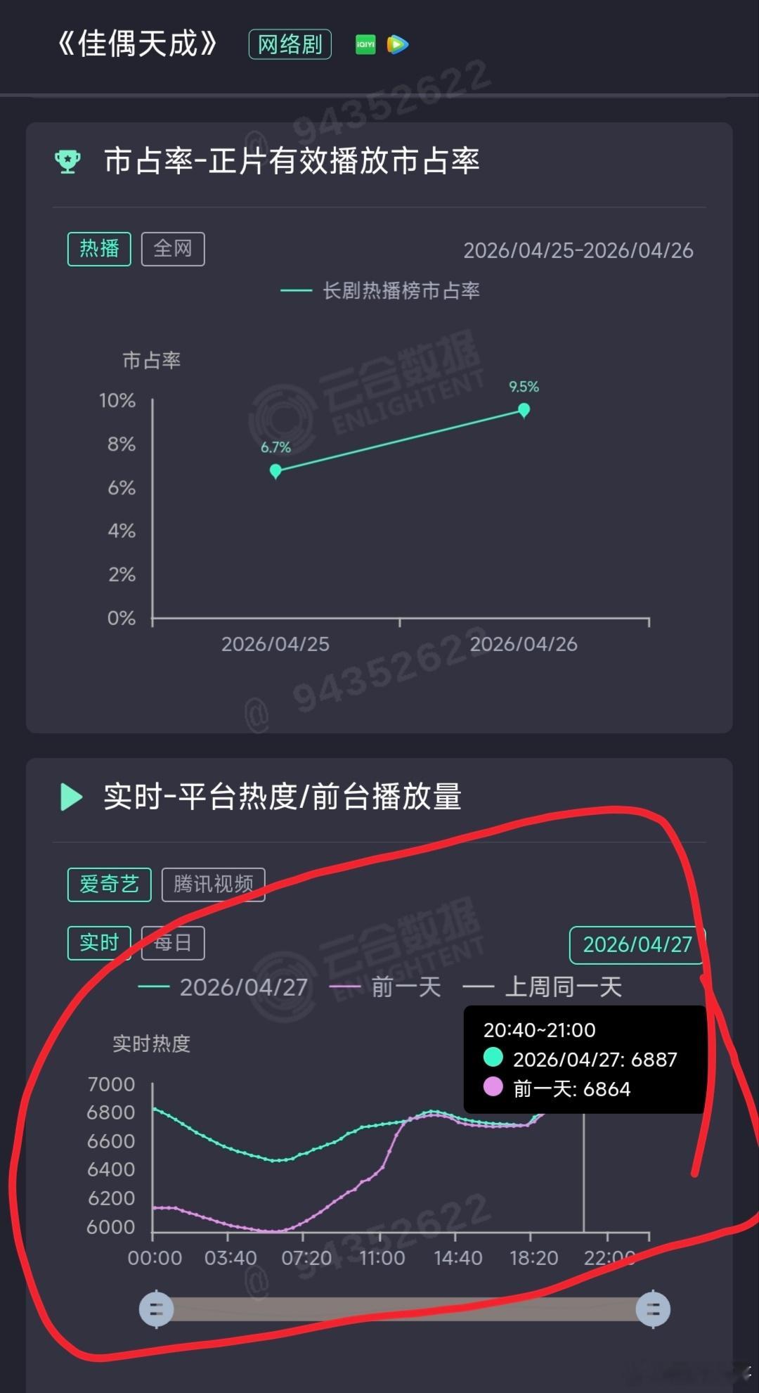 任嘉伦的佳偶天成走势真的很不错,今天是工作日周一,🐧和🥝的全天热度几乎全程领