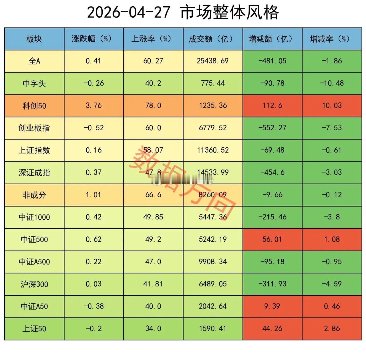 大盘震荡分化,全A指数涨幅0.41%,一边是以半导体产业链、CPO为代表的科技股表现尤为抢眼,一边是一些传统板块有所调整,个股上涨率为60%,成交额较上周五小幅缩减2%。