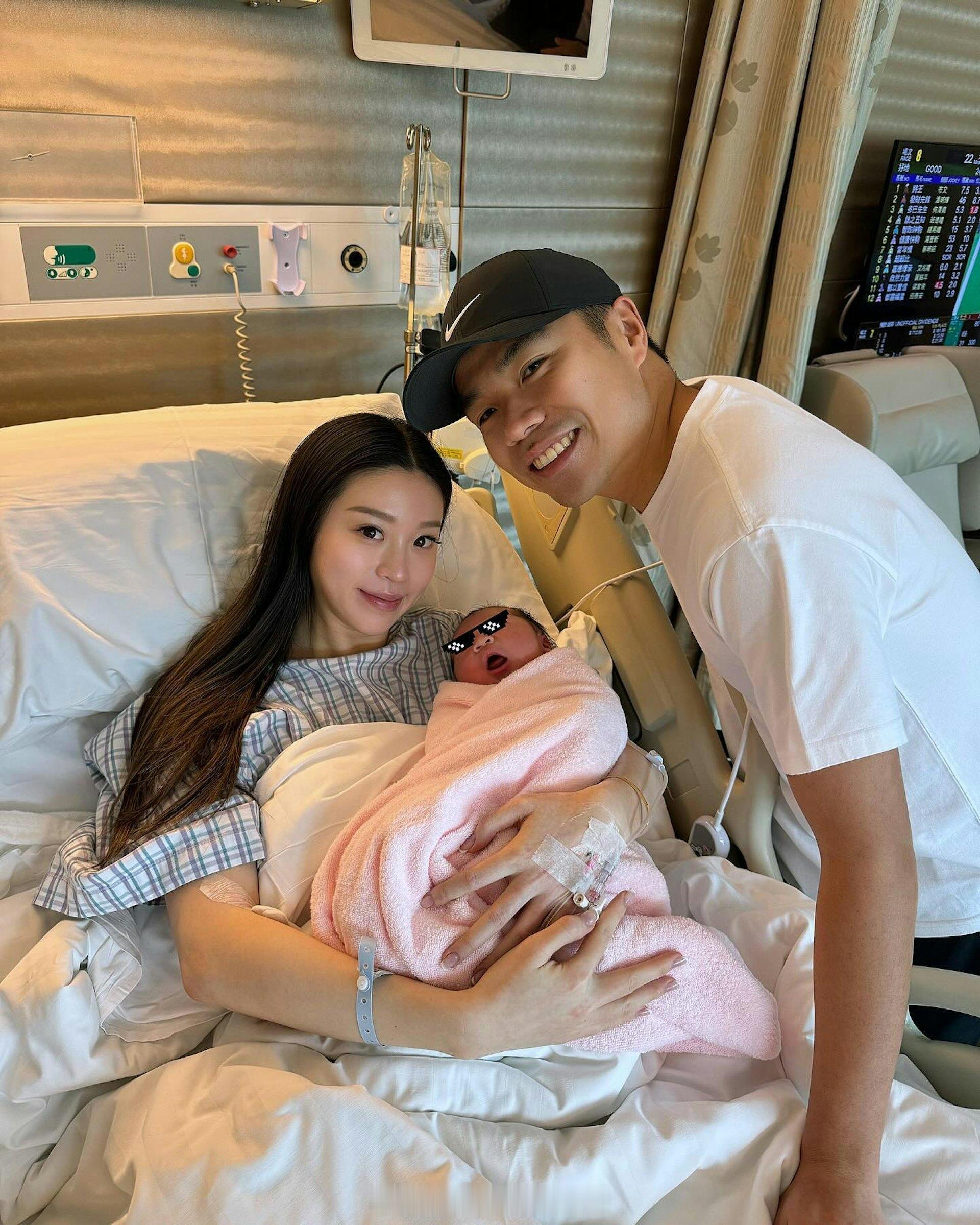 她晒出医院床上的温馨全家福,配文「Ashton Kwok 」。画面中,刚生产完的她妆容精致,精神饱满,手抱初生婴儿,丈夫郭浩泉依偎身旁甜笑,一家三口满溢幸福感。为保护宝宝隐私,她用emoji遮挡婴儿眼部,仍可见宝宝五官精致、头发浓密,与妈妈样貌相似。