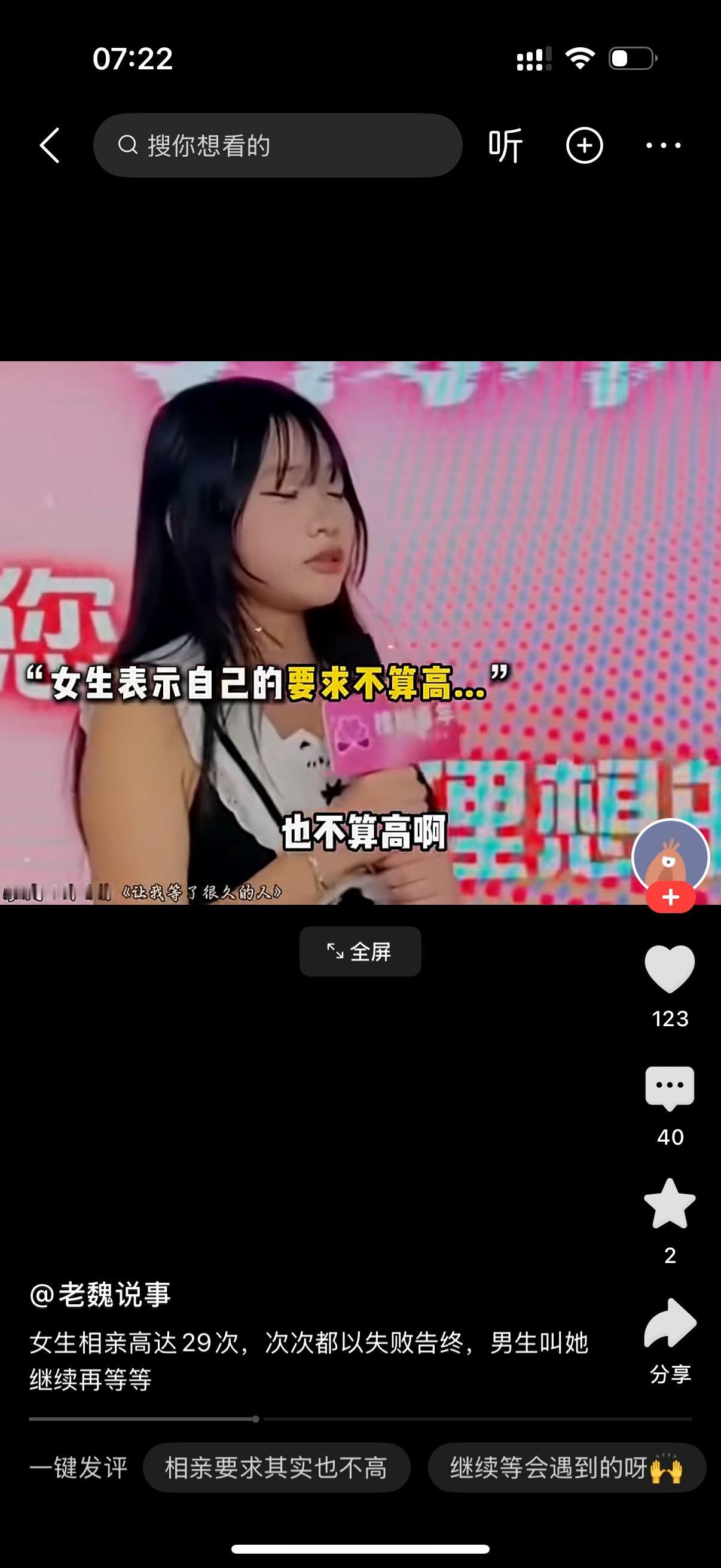 女子坦言对方是自己今年相亲的第30个了。男子说,你可真厉害,平均三四天就相亲一次