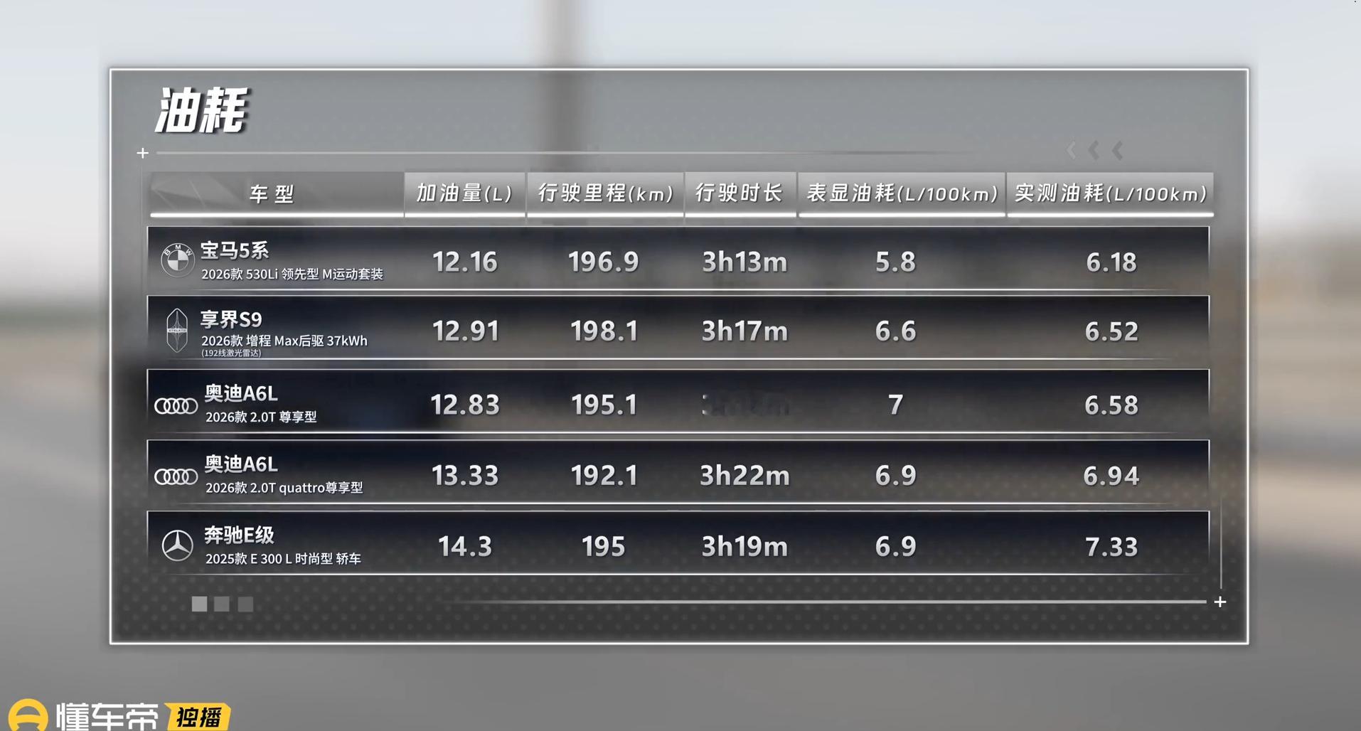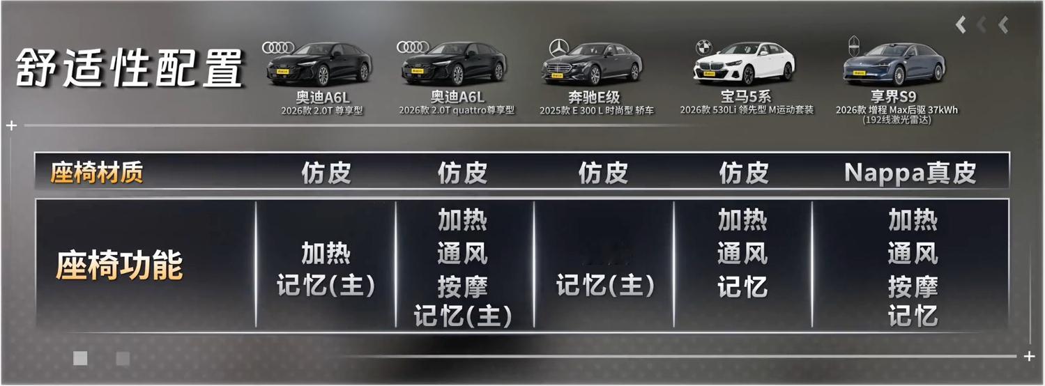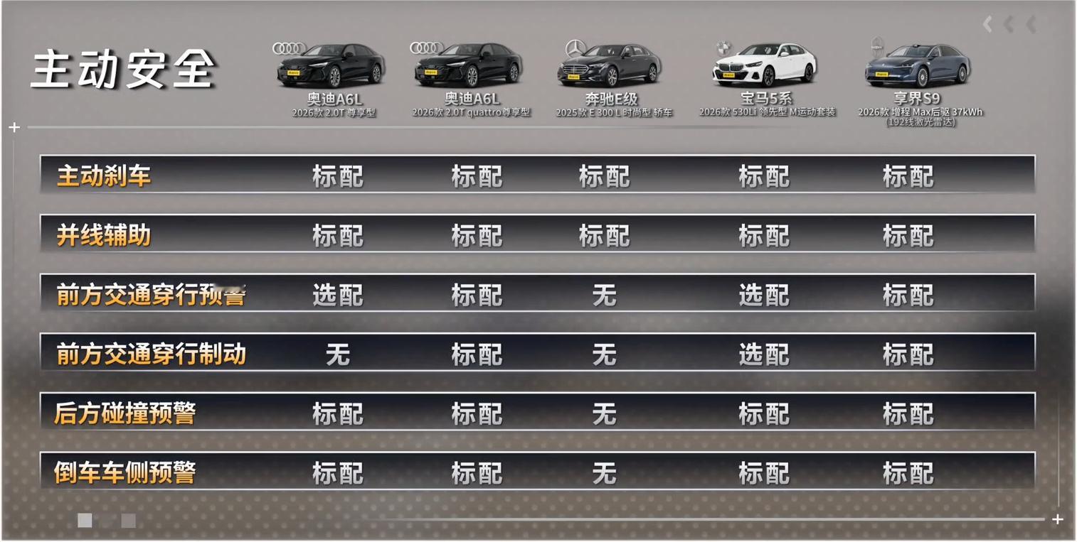 三十五万级豪华轿车,到底应该怎么选?吴烦恼说车&十万伏特有马力带来的最新一期节目,把享界S9和传统德系选手奔驰E级、宝马5系、奥迪A6L拉到了同一个场地,从加速、刹车、麋鹿到AEB,一项一项硬碰硬,为大家呈现了一场精彩绝伦的豪华轿车性能大对决。先看最让人意外的麋鹿。一向主打舒适的奔驰E级反而表现出色,其悬架回弹利落,重心转移速度快,在紧急避险时,车身姿态稳健,甚至压过了以操控见长的宝马5系。而宝马5系偏软的悬架调校在极限状态下侧倾明显,影响了最终成绩。奥迪A6L凭借quattro四驱系统的实时动力分配,高速变线时四个车轮像被按在地面上,操控上限和安全感明显更高。享界S9作为全场最重的选手,麋鹿成绩与宝马5系持平。这得益于纯电平台带来的低重心,加上ESP电子稳定程序的高效介入,证明了电控系统可以有效弥补车身重量对灵活性的影响。绕桩环节同样精彩。奔驰E级和宝马5系在这个项目上像是互换了人设。E级的电控介入感很弱,车尾跟随性相当好,开起来颇有乐趣;5系反而在连续重心转移中显得有些吃力,悬架支撑性不如预期。奥迪A6L依然是四驱系统的教科书级表现,出弯牵引力和轨迹稳定性一骑绝尘。享界S9车身侧倾控制得当,整体表现稳健可控,也直接回应了此前网络上的一些争议。真正拉开差距的是AEB中。120公里每小时的速度下,只有享界S9稳稳刹停。它全系标配四颗激光雷达加上华为ADS智驾系统带来的全维融合感知能力,让它在极限场景中具备了更早识别、更快决策的底层优势。而BBA三款车型在这个极限工况下,系统没有给出有效干预,这是硬件架构决定的物理边界。加速刹车中,奔驰E级和宝马5系的对比零百加速成绩都比官方更快,出现了反向虚标的情况。奥迪A6L的四驱版和两驱版加速差距接近2秒,quattro四驱能杜绝起步打滑,动力释放直接高效;而前驱版则会有明显的轮胎打滑和动力损失。不过,面对新款奥迪A6L刹车卡钳规格的争议,对比其百公里刹停距离名列前茅,证明整套制动系统的效能依然非常出色。如果你的购车预算是三十五万元,但又担心安全与性能?上懂车帝搜索”35万轿车,懂车帝上独播的这档达人的三十五万级豪华家轿怎么选节目,为你揭开答案,让你不再为选车而纠结。三十五万左右买什么车 懂车帝独播