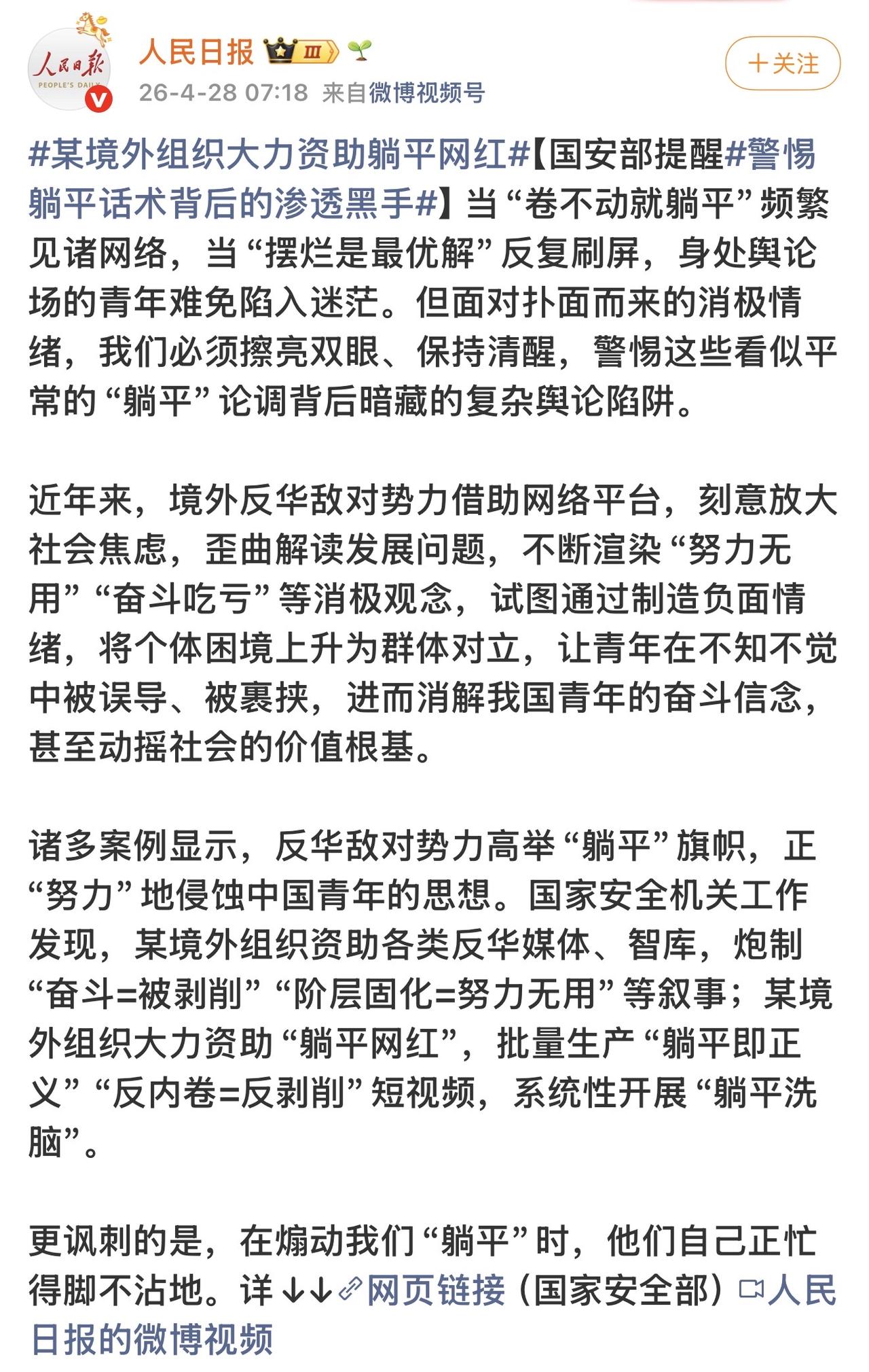 国际斗争形势还是很严峻,官方终于发文了,原来真有人利用“躺平”试图瓦解青年的奋斗!