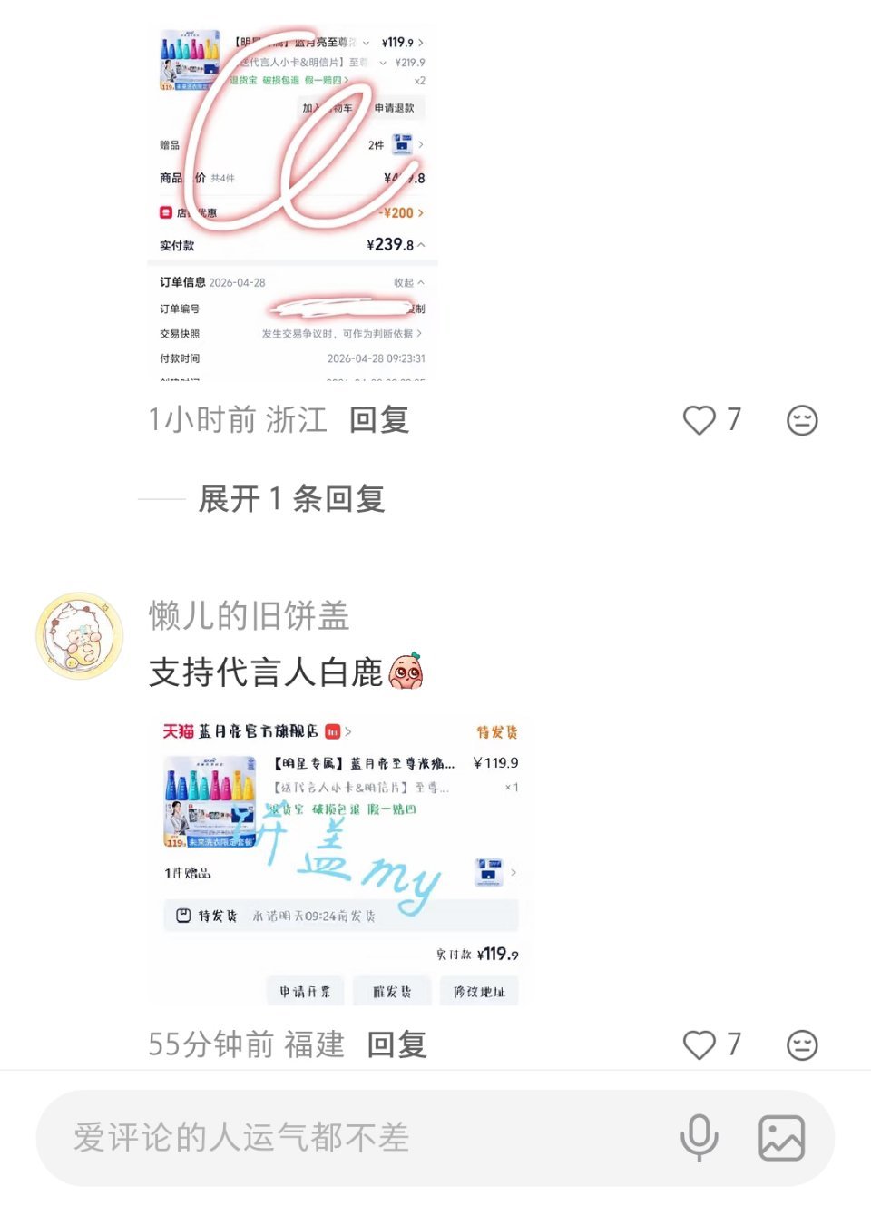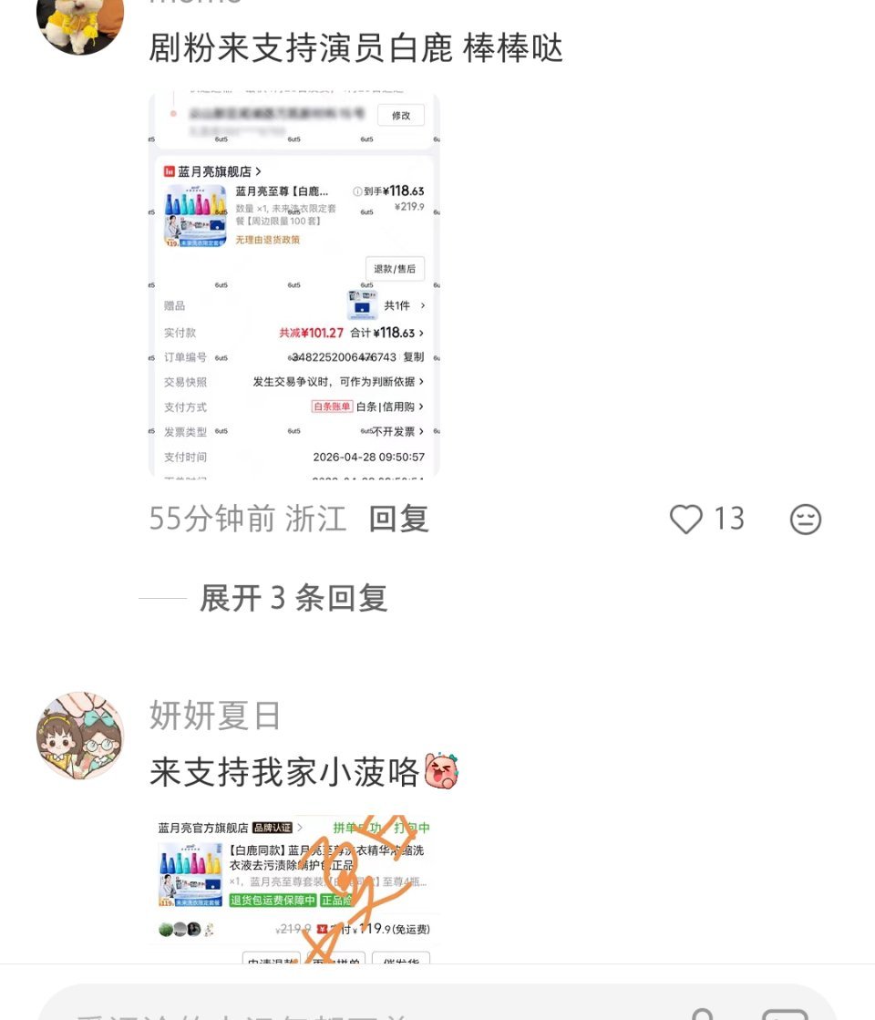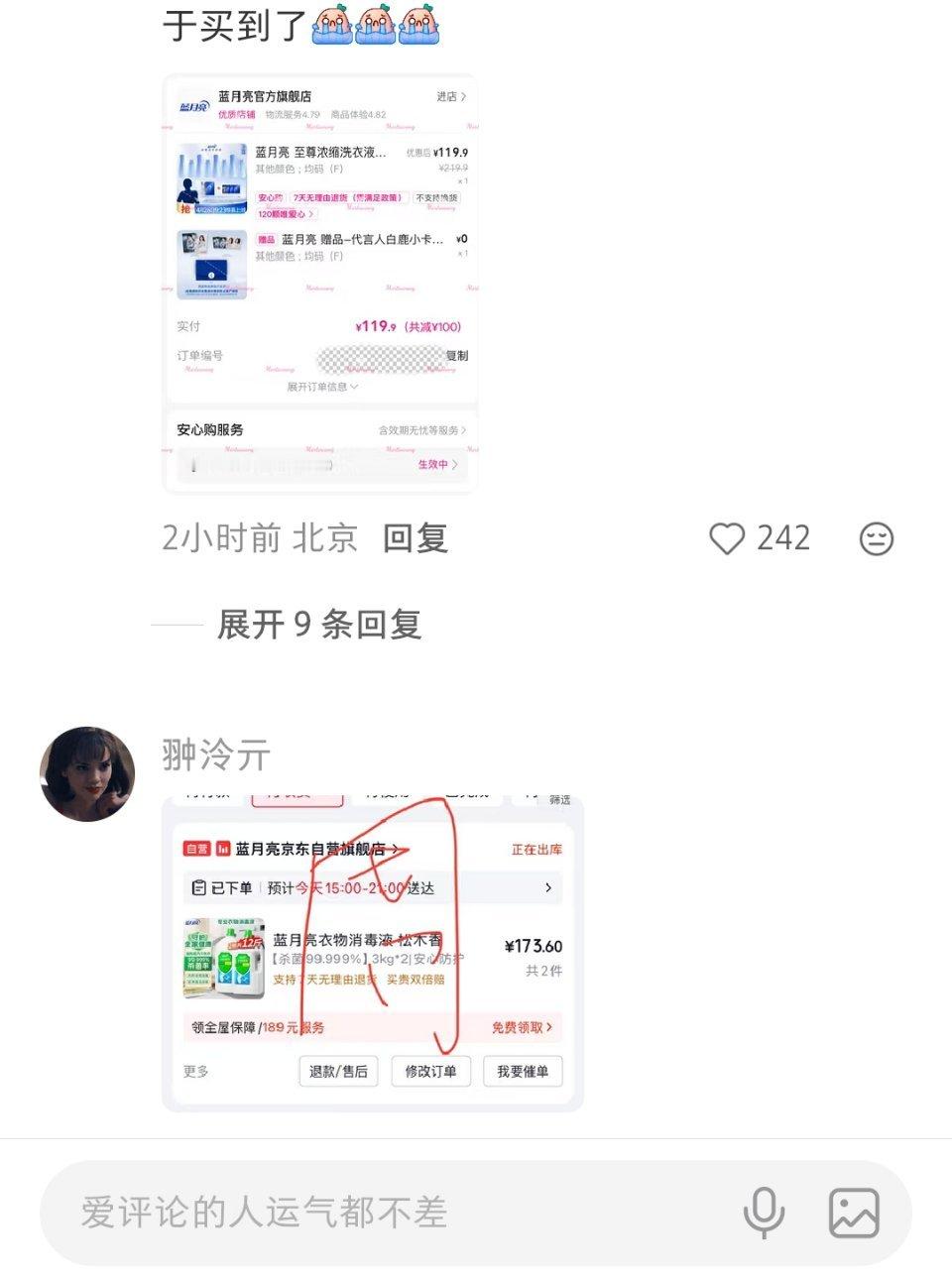 白鹿粉丝哪里练的手速?全网各平台带白鹿周边的蓝月亮洗衣液都被你们刮干净了,京东是补货补货又补货。别人官宣评论区是控评,你们官宣评论区是晒单!白鹿的洗衣新搭子