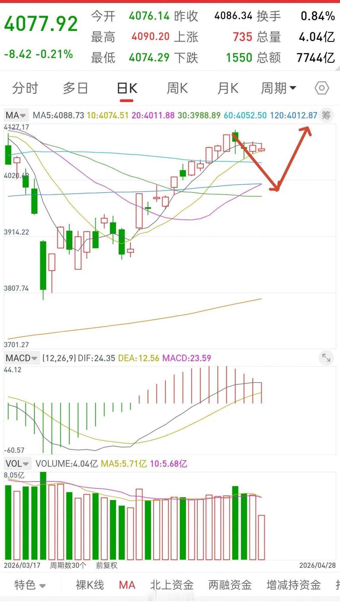 当前大盘,要谨防后面随时出现一根中阴线,这几天都是一个观点,那就是要么多看少动,要么等一根中阴线砸下来再进场。