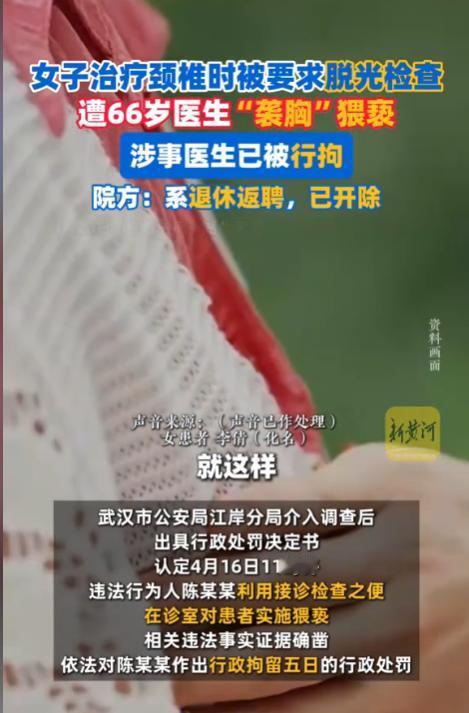 湖北武汉,一女子去找66岁的老中医扎针,在扎针结束后被老中医带到单人诊室继续检查,还被要求脱掉全身的衣服,包括内衣裤。女子虽有所怀疑,但还是照做了。等检查结束后,女子背对着老中医穿衣服,谁知老中医竟然直接伸手摸了下女子的胸部。女子被吓坏了,立即穿上衣服逃了出去并报了警。