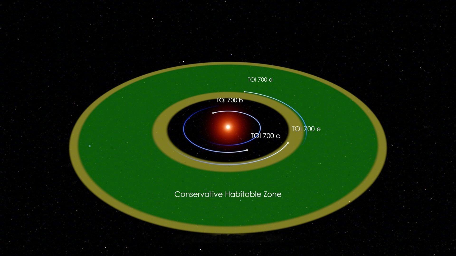 图为TOI-700恒星系统示意图,包含各行星轨道及宜居带位置,图源:NASA/JPL-Caltech/Robert Hurt/NASA’s Goddard Space Flight Center