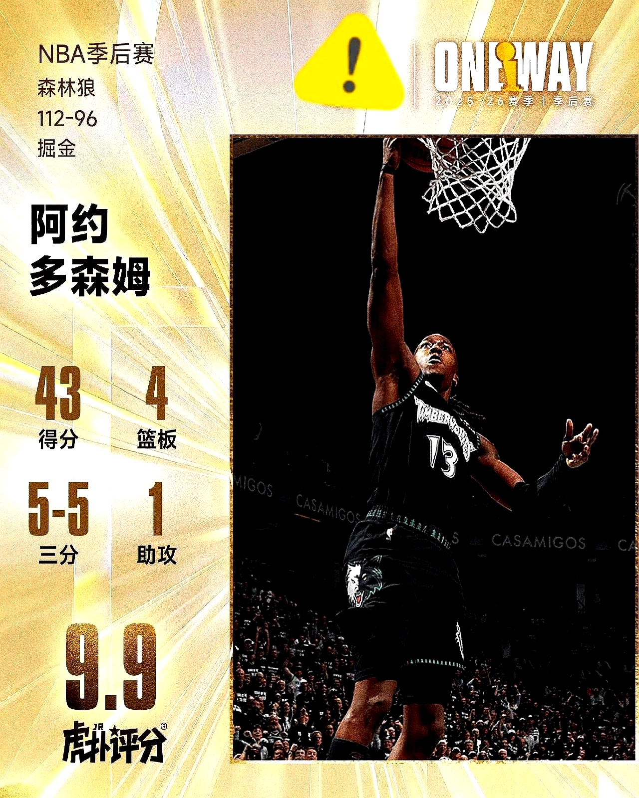 他全场17投13中,三分5中5,罚球12中12,硬生生轰下43分,把卫冕冠军掘金打懵了,森林狼3-1拿到赛点。