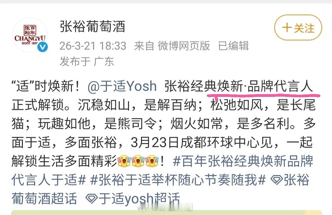 于适3.21官宣张裕葡萄酒品牌代言人4.28升为全球T至此,2026所有新增代言