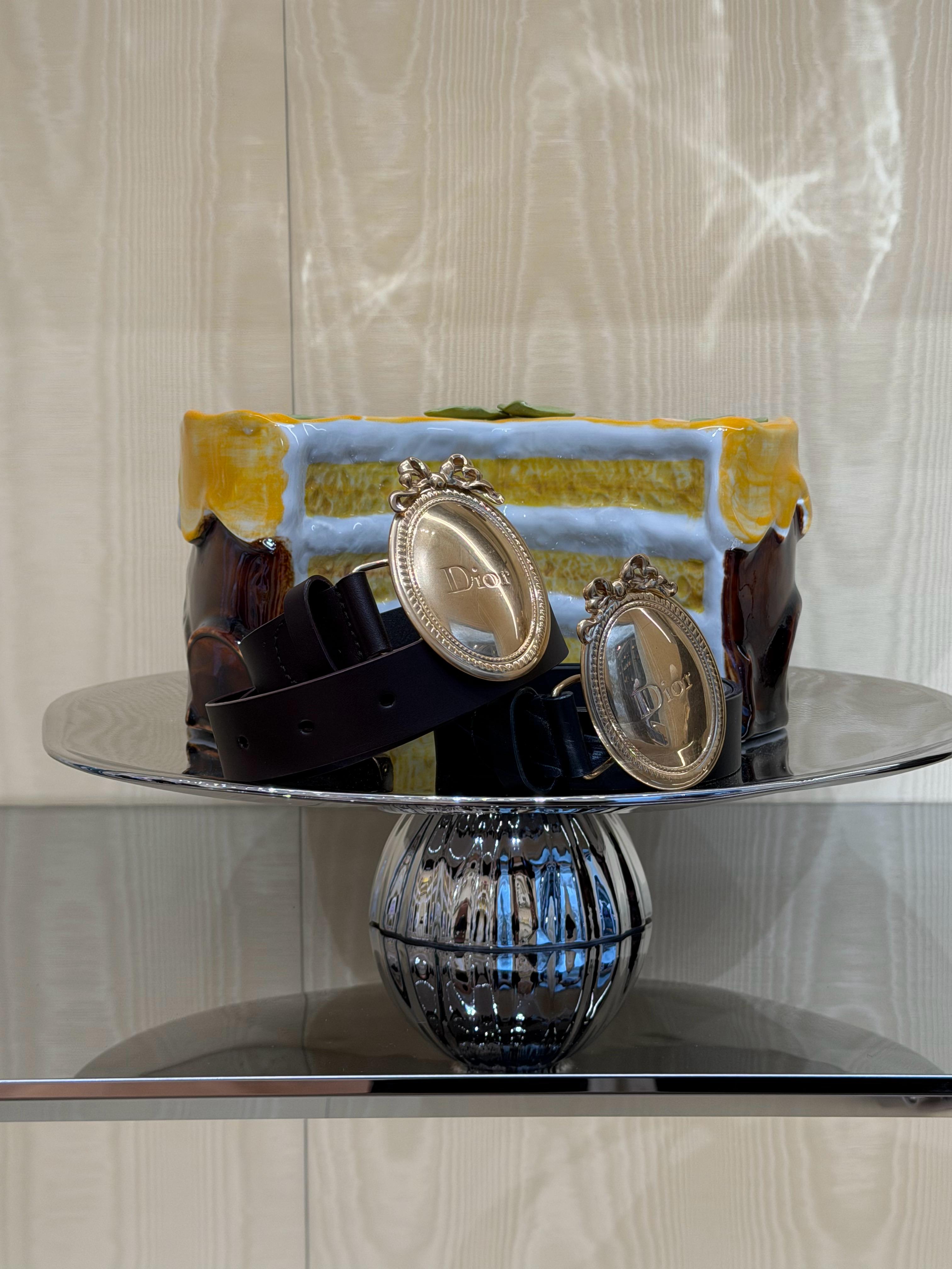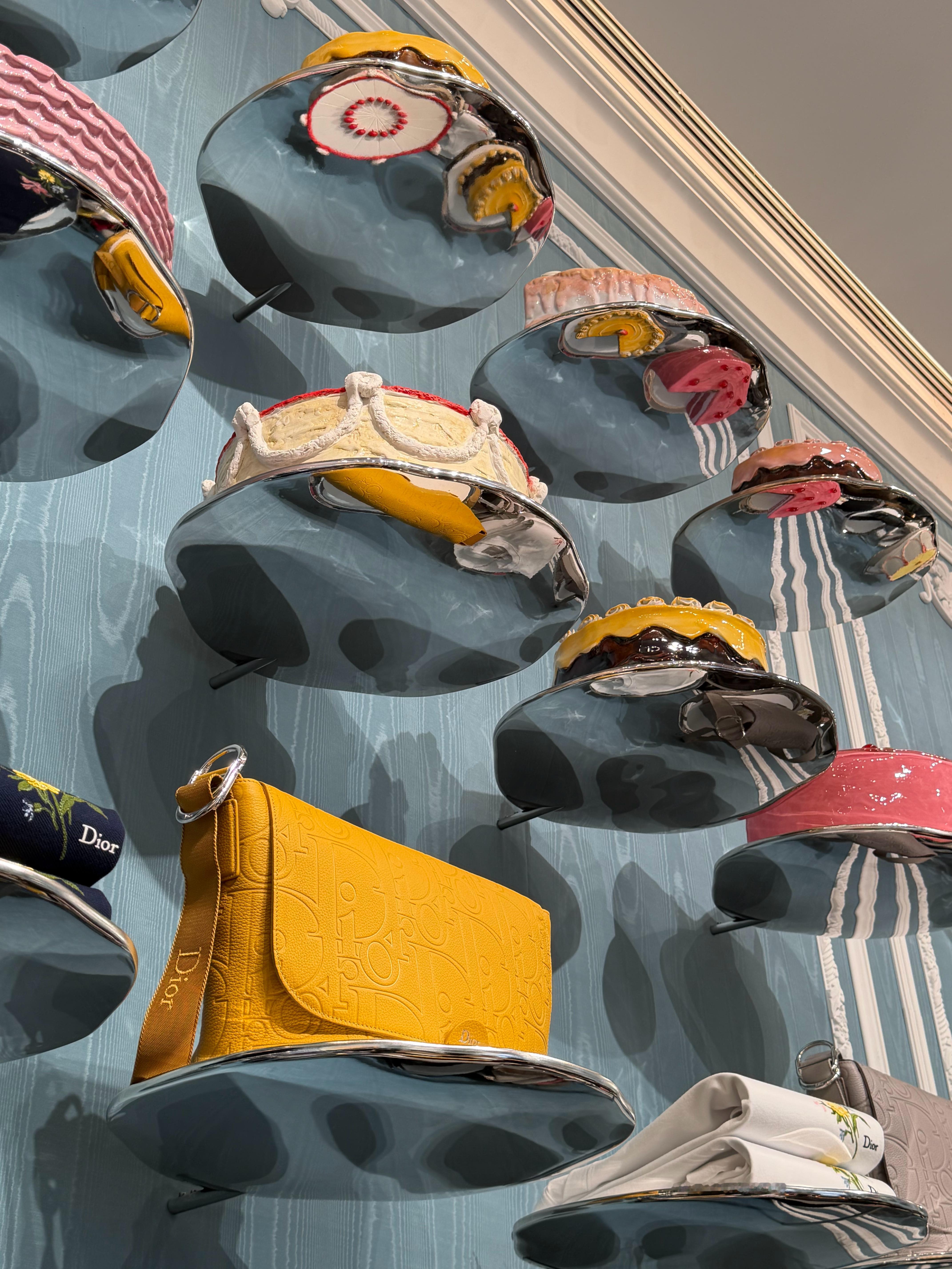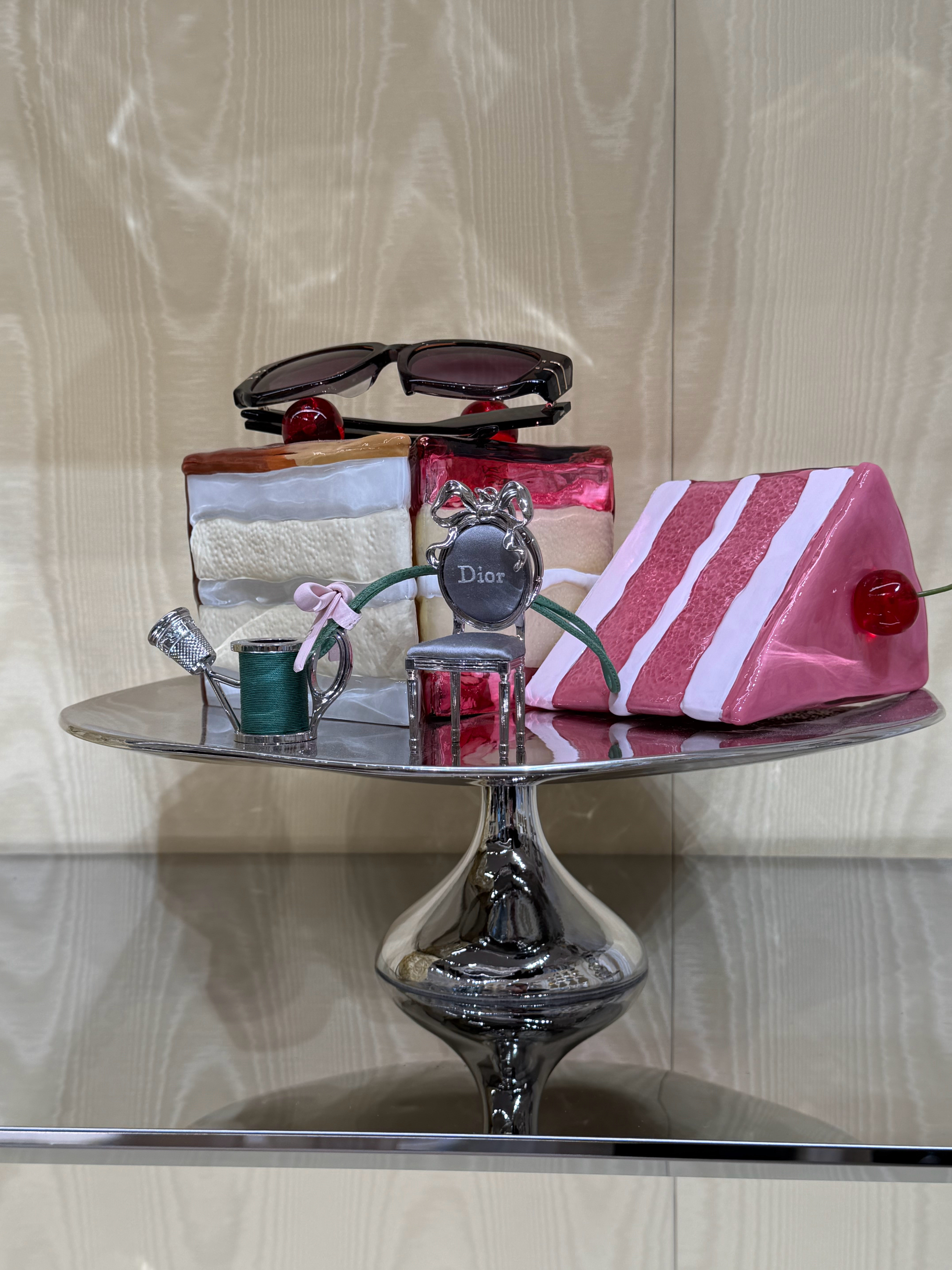 本次限时空间专为Jonathan Anderson全新秋季系列打造,整座装置幻化为巨型夹心蛋糕,草莓樱桃点缀顶部,氛围感直接拉满。复刻凡尔赛宫风格的雕饰线条与云纹绸布景,搭配工匠手工烧制的玻璃、陶瓷仿真蛋糕摆件,精致细节与迪奥成衣臻品交相辉映。