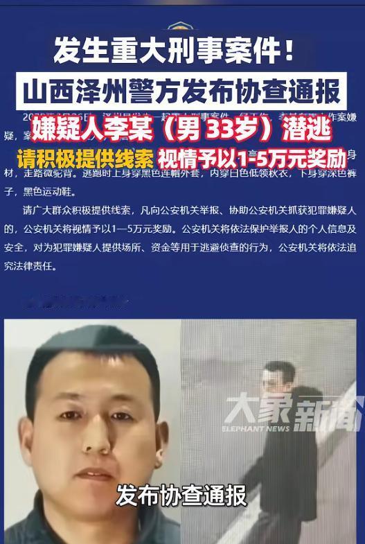 目前,泽州警方正全力侦破此案,并在全省及周边省份发布悬赏通告,对提供有效线索、协助抓获嫌疑人的,将给予1万至5万元不等的奖励。