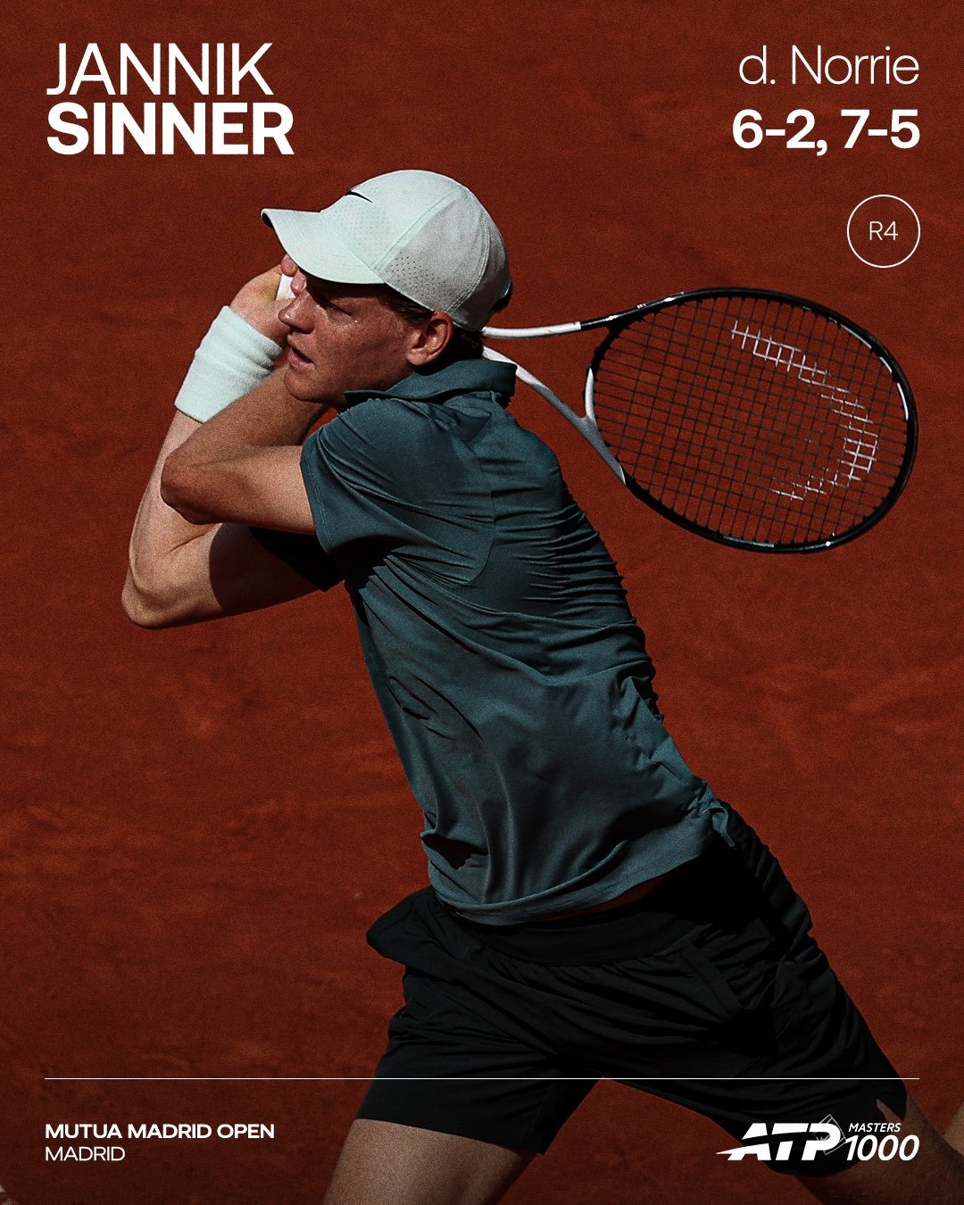 辛纳🇮🇹继续两盘横扫英国的诺里,比分6:2,7:5轻松晋级马德里8强✅生涯第