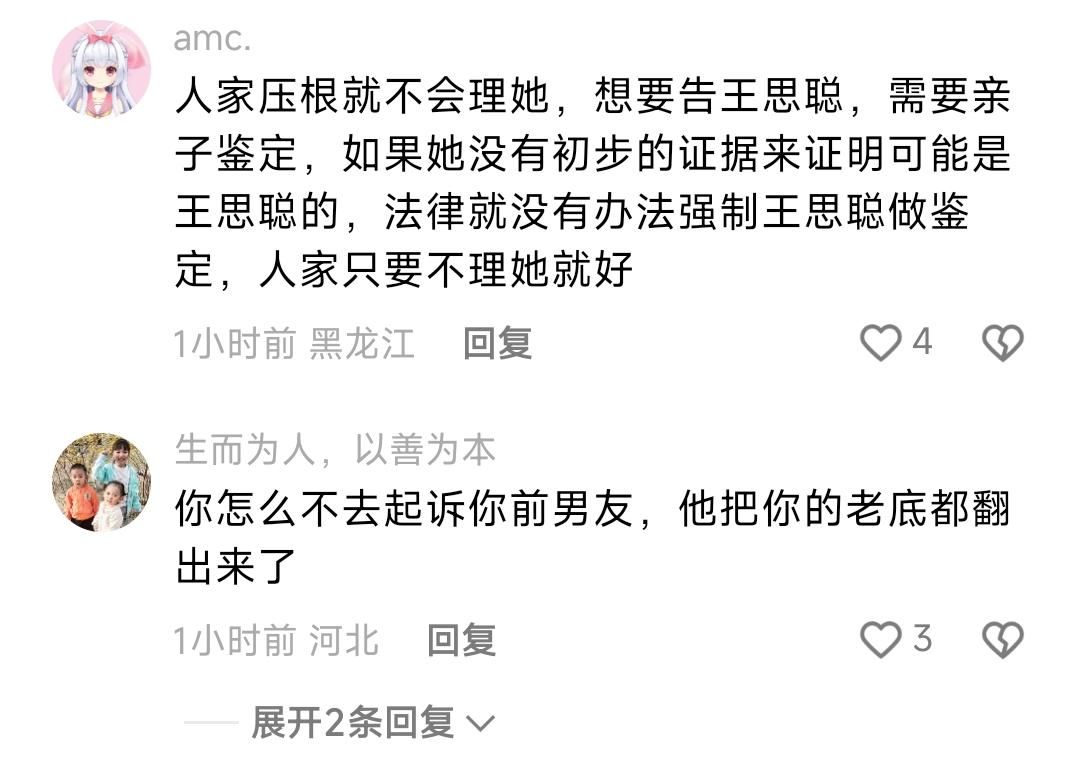 网友评论:人家压根就不会理她,想要告王思聪,需要亲子鉴定,如果她没有初步的证据来证明可能是王思聪的,法律就没有办法强制王思聪做鉴定,人家只要不理她就好