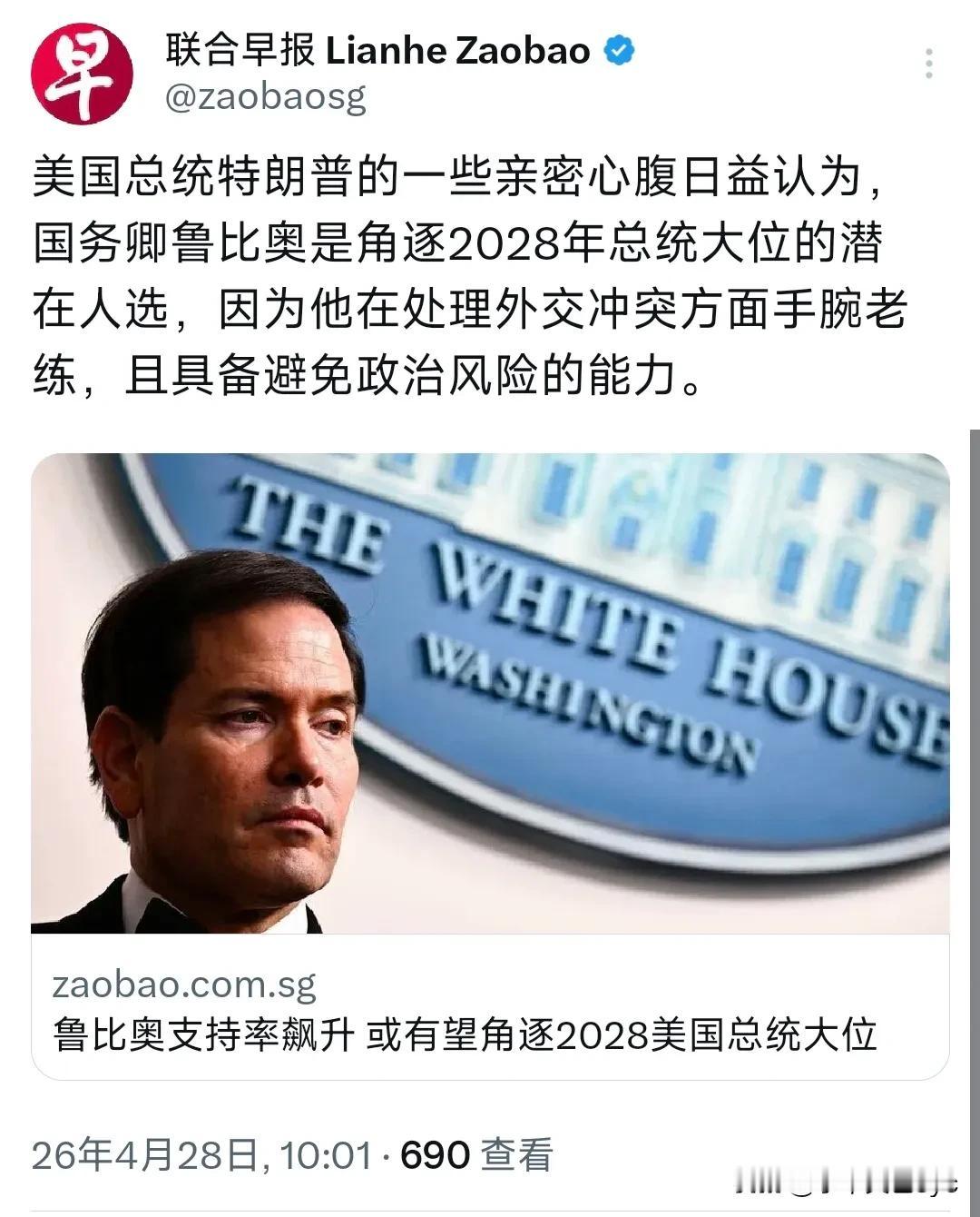 新加坡联合早报4月28日报道:“美国总统特朗普的一些亲密心腹日益认为,国务卿鲁比奥是角逐2028年总统大位的潜在人选,因为他在处理外交冲突方面手腕老练,且具备避免政治风险的能力。”