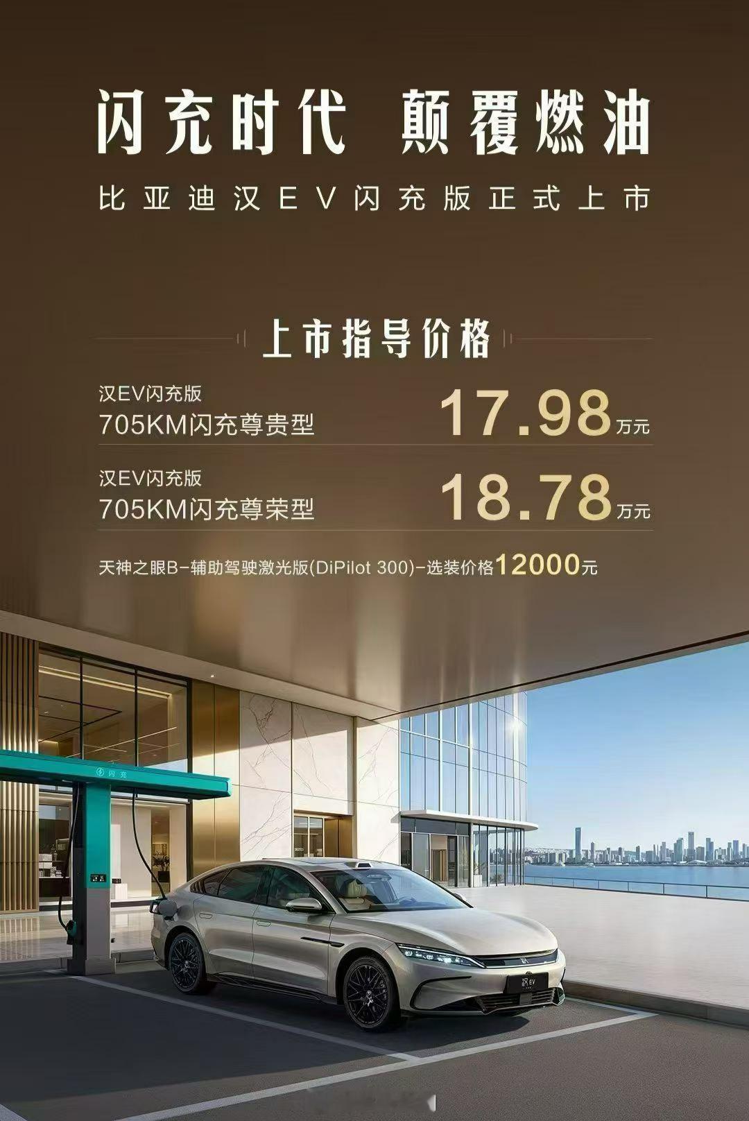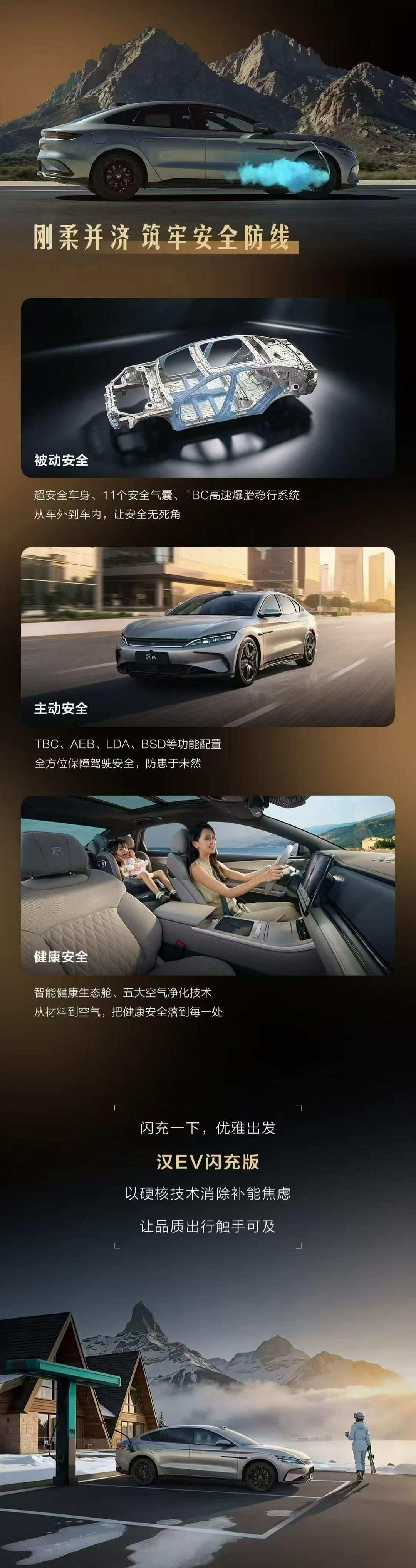 全球电耗最低的C级轿车!刚刚,汉EV闪充版迎来正式上市,指导价17.98万~18.78万,新车配有705km续航+天神之眼5.0+云辇-C+TBC高速爆胎稳行系统。