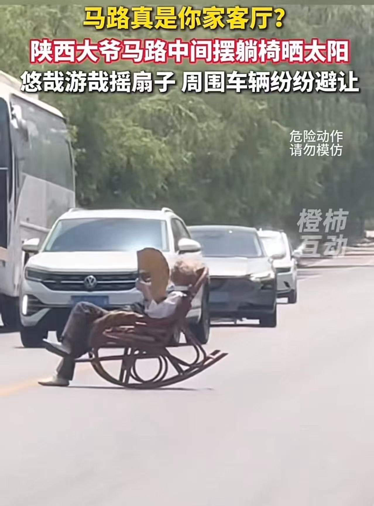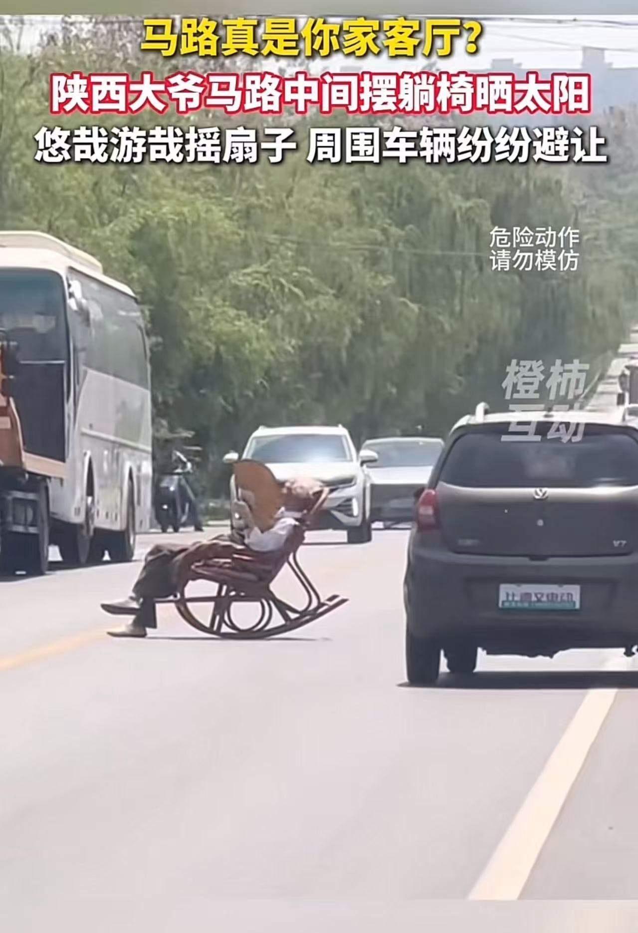“出于什么心理,才会做出这样的事情?”陕西,大爷把马路当客厅,在路中间摆躺椅晒太阳,悠哉悠哉摇扇子,过往车辆纷纷避让。网友:如果有车不小心撞上去了,要赔偿吗?