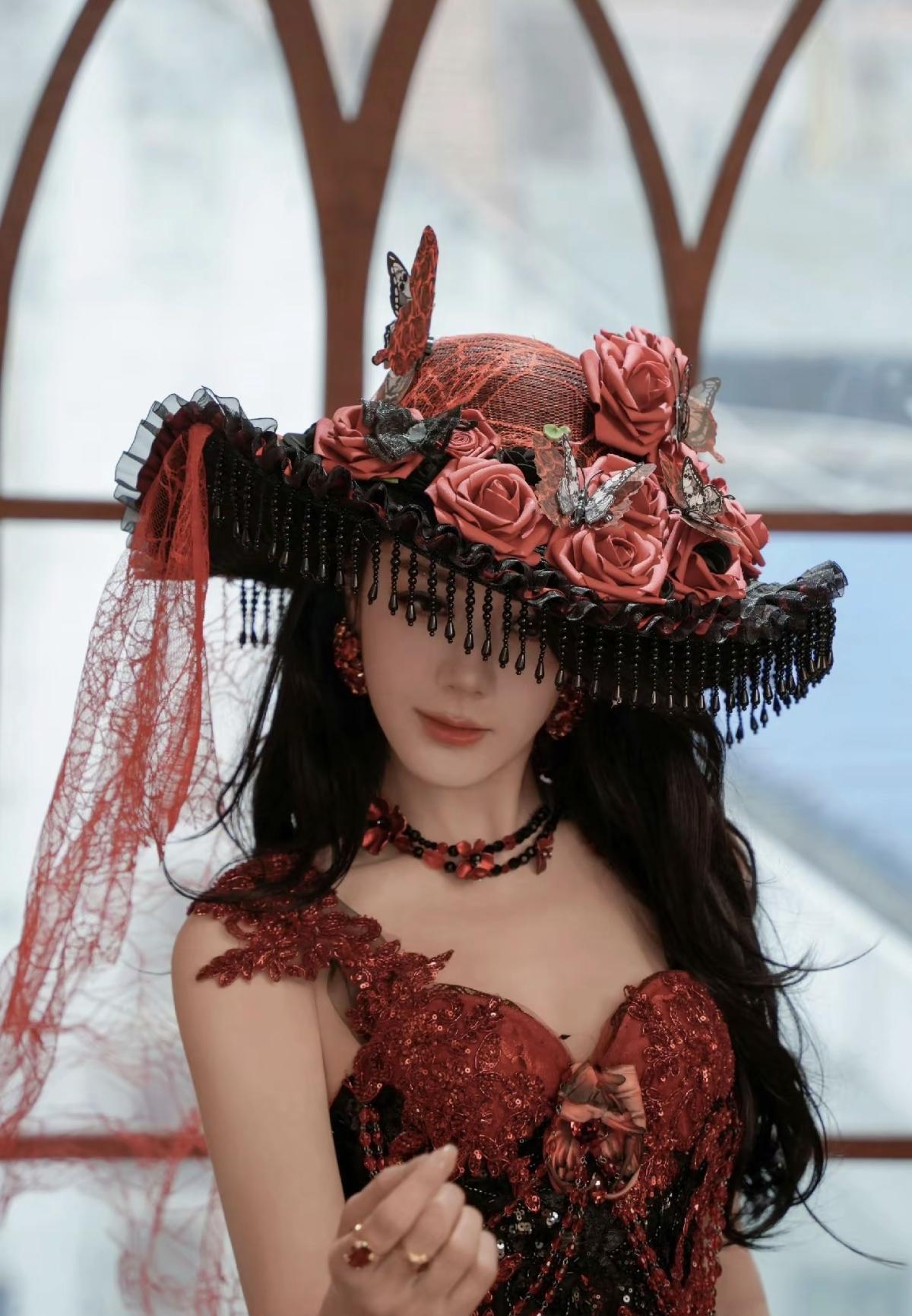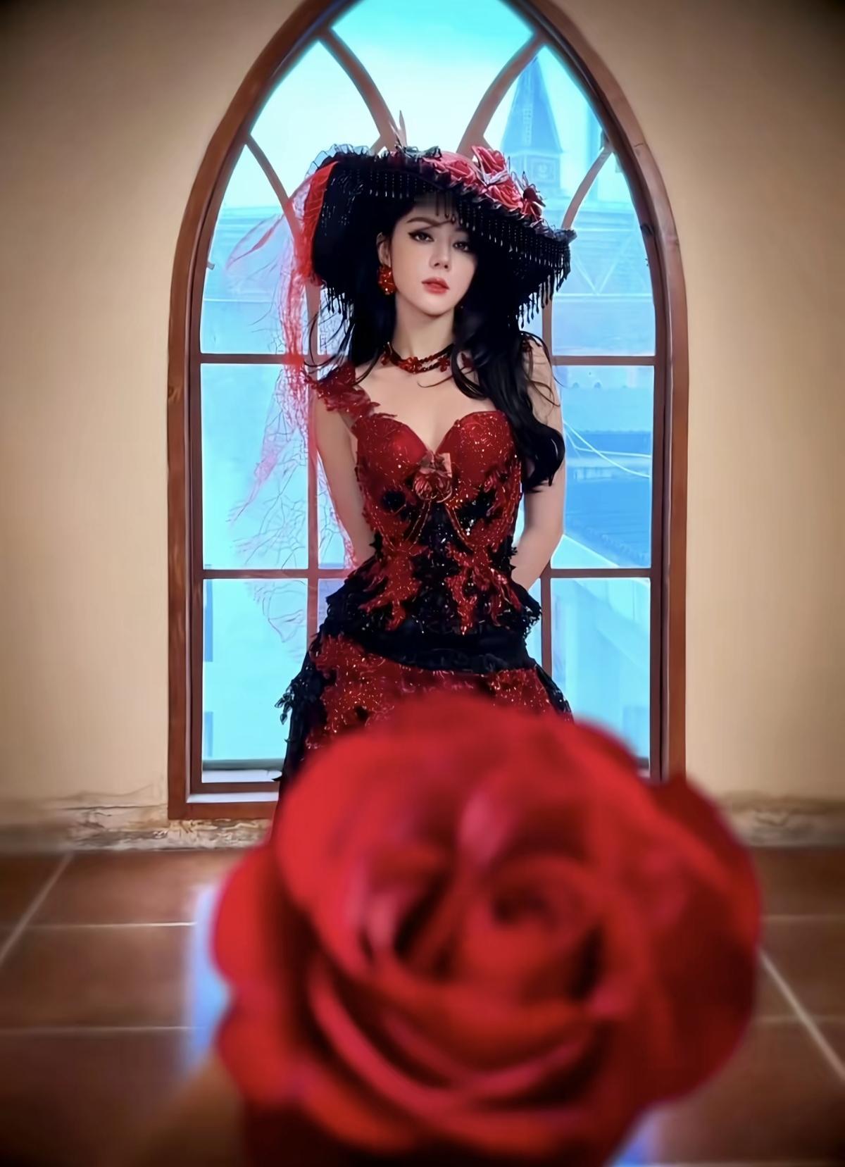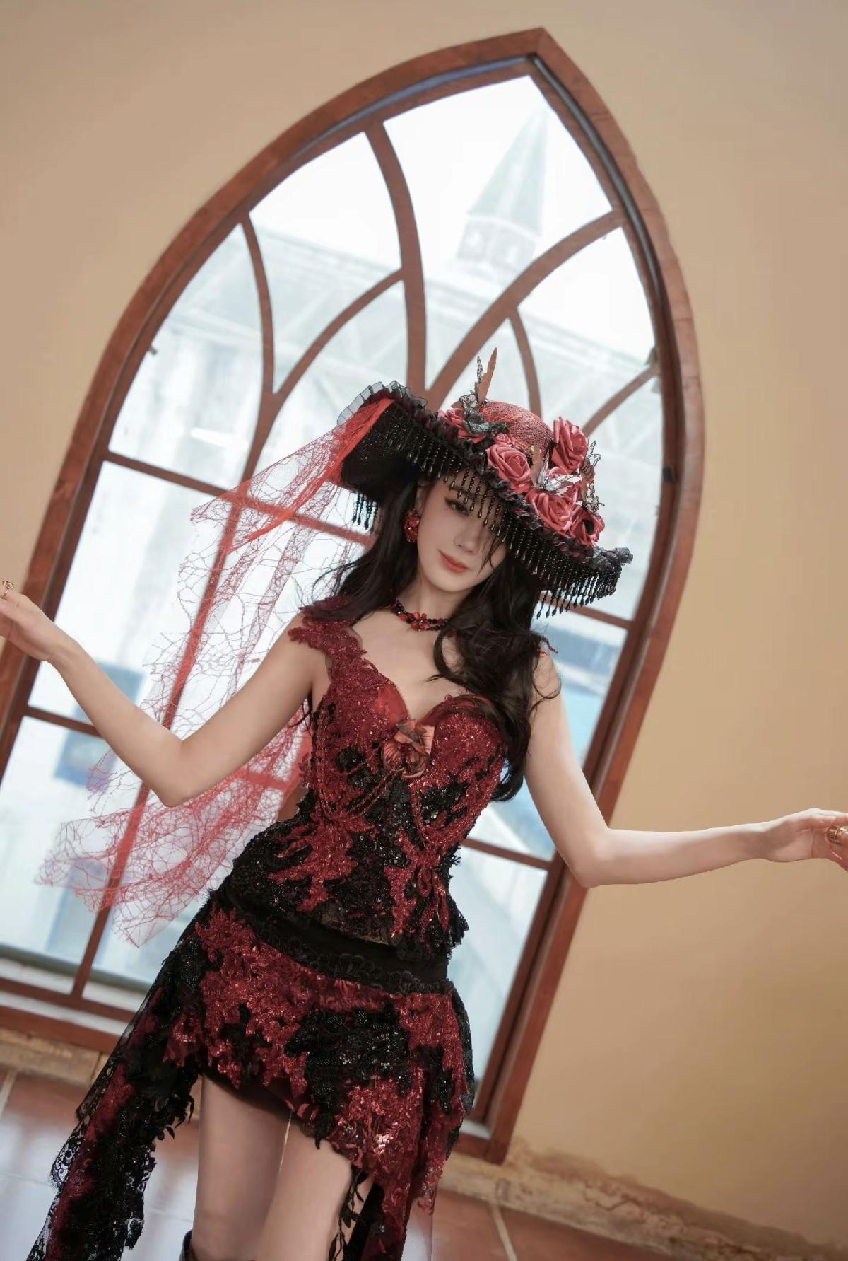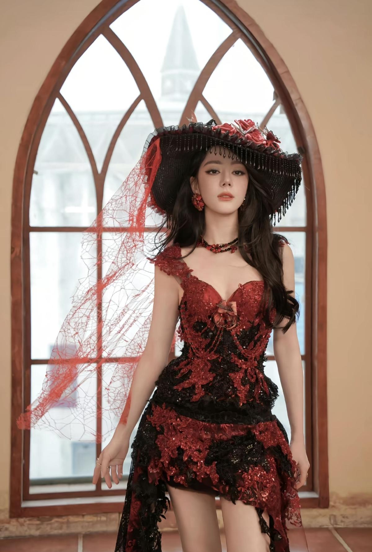 迪丽热巴暗夜玫瑰从不低头,自带生人勿近的贵族气场[赞]迪丽热巴古堡窗前的红玫瑰,
