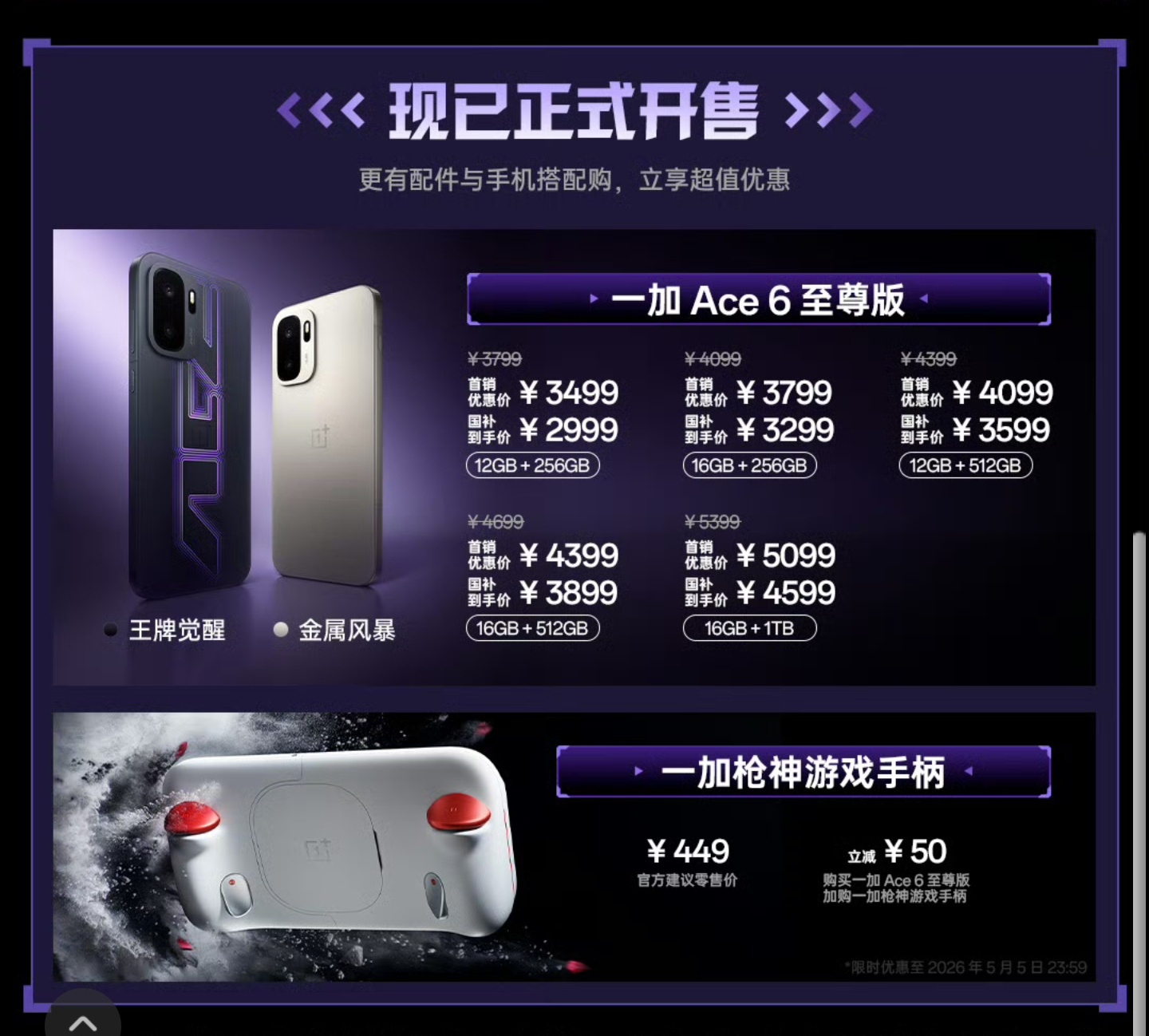 一加Ace6至尊版价格揭晓了(首销+国补到手价):12+256G2999元