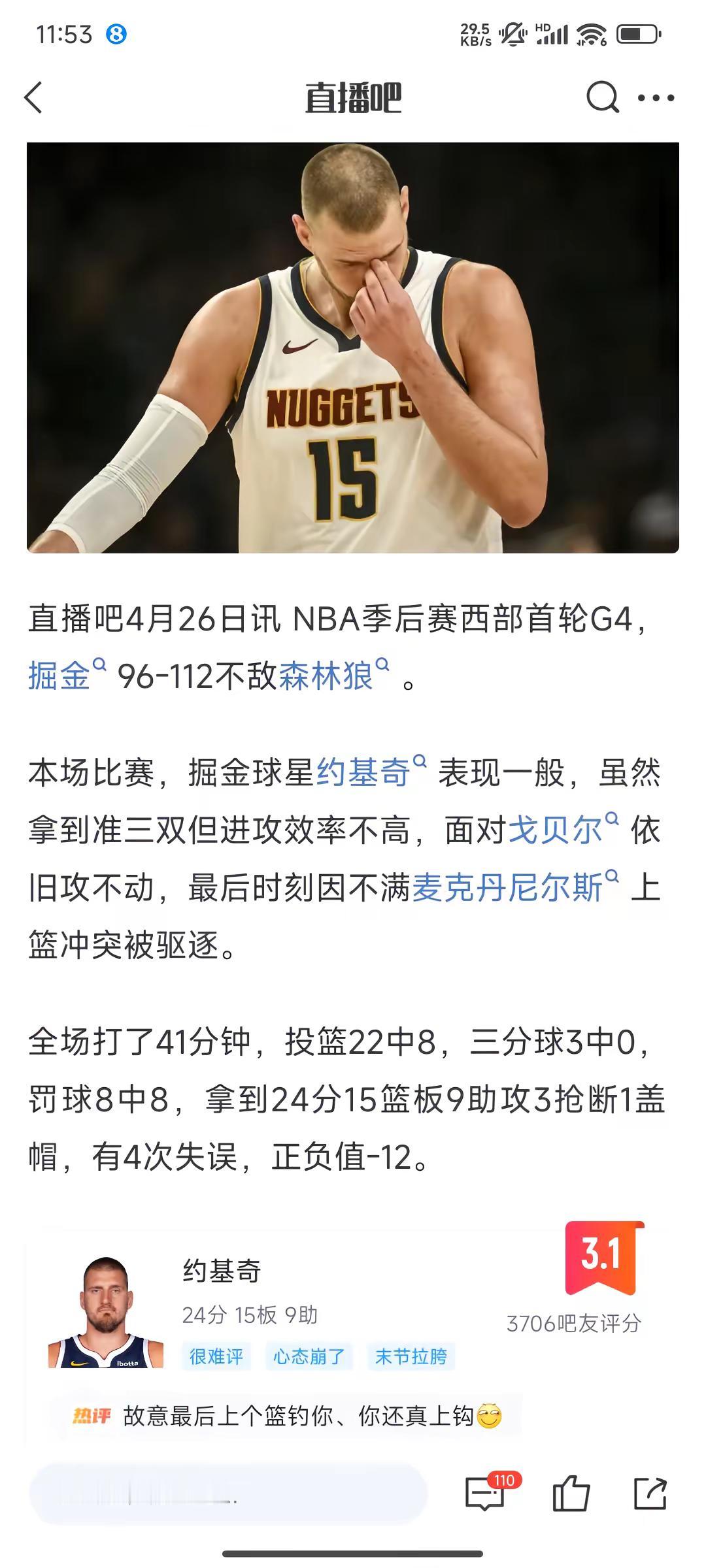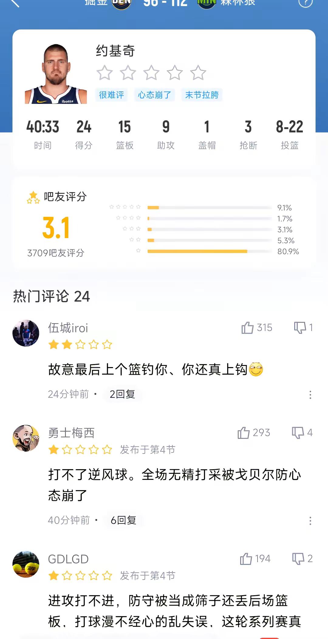 心态有点崩?约基奇24+15+9还被驱逐。掘金vs森林狼 约基奇 球员评分 约基奇麦丹冲突 nba吐槽大会