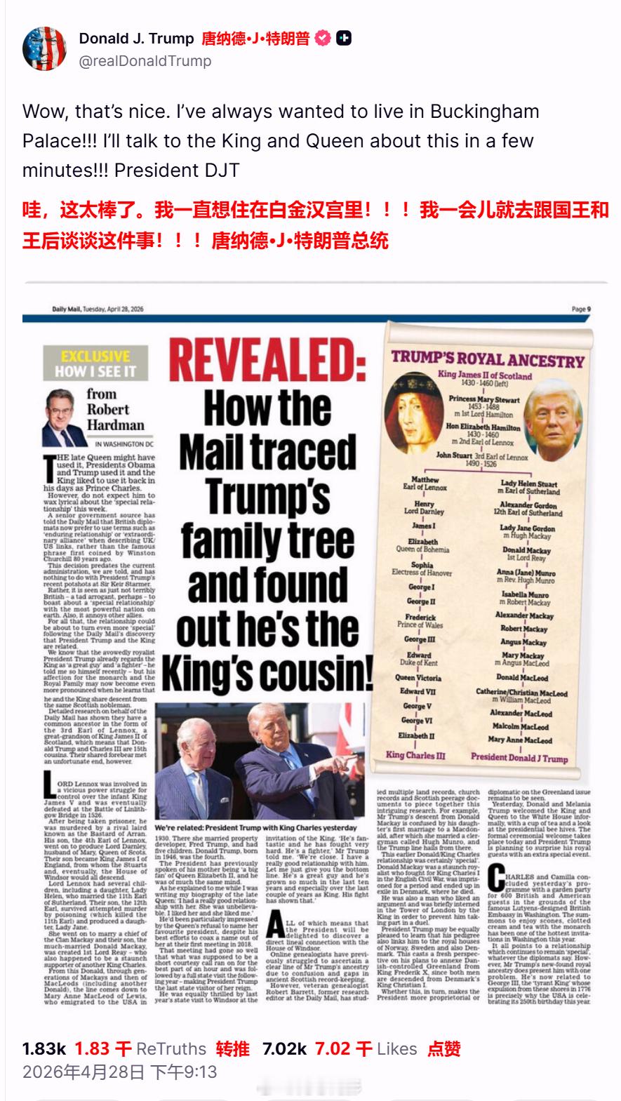 特朗普转发了一则不知道哪里来的地摊报道,报道上说他是英国国王的表亲,特朗普写道:“哇,这太棒了。我一直想住在白金汉宫里!!!我一会儿就去跟国王和王后谈谈这件事!!”(英国国王查尔斯三世目前正在美国访问)