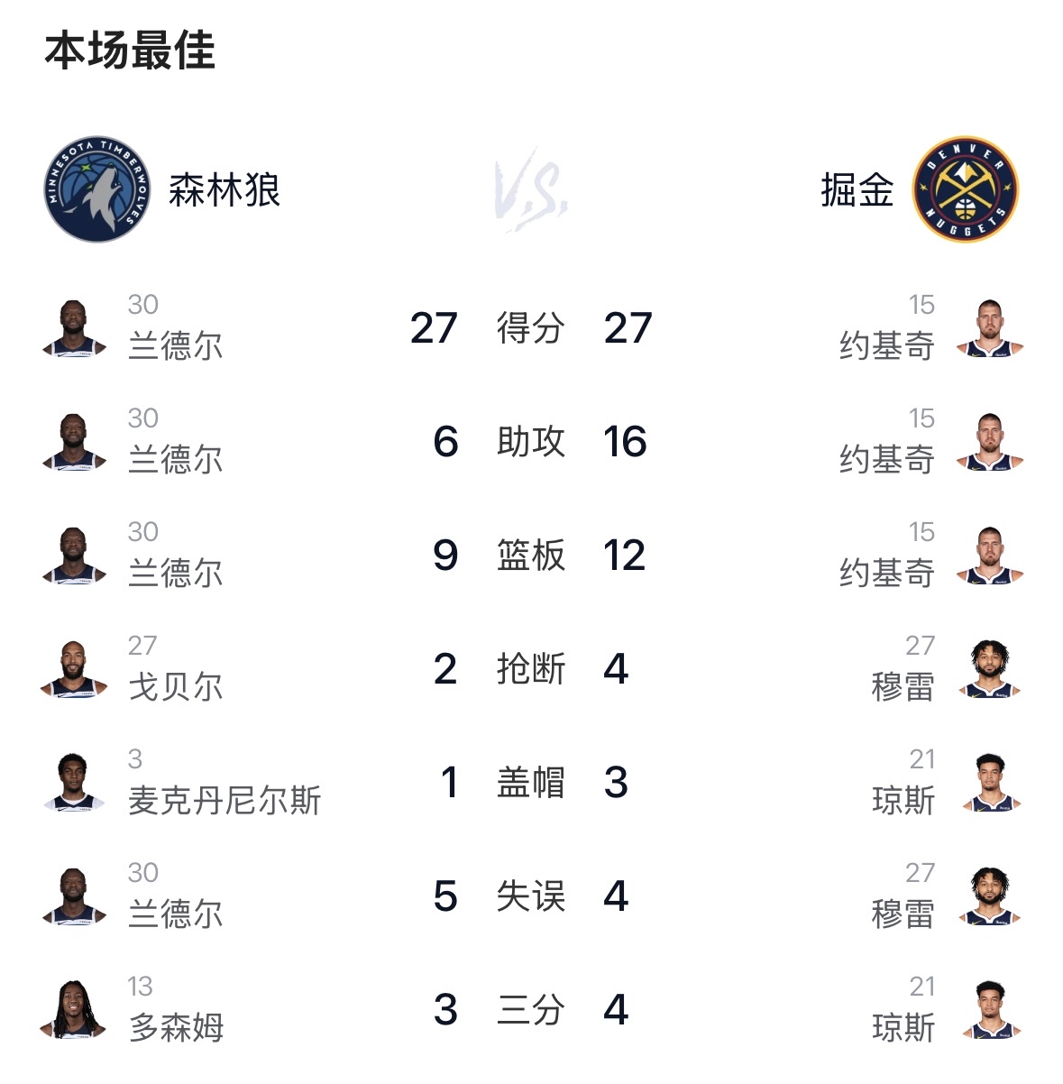 末节森林狼并未缴械。兰德尔带队掀起一波攻势——他先是低位背身强打约基奇打进2+1,随后又突破分球助攻多森姆命中反击三分,森林狼一度将分差追至仅剩10分,掀起反扑高潮。但关键时刻布劳恩在左侧底角接到约基奇从高位穿透防线的横传,毫不犹豫出手三分命中,浇灭了对手翻盘的希望;约基奇随后面对戈贝尔完成2+1锁定胜局,再度以连得5分的表现亲手终结比赛悬念。全场森林狼共出现25次失误,这一致命数据成为他们最终输球的核心原因。