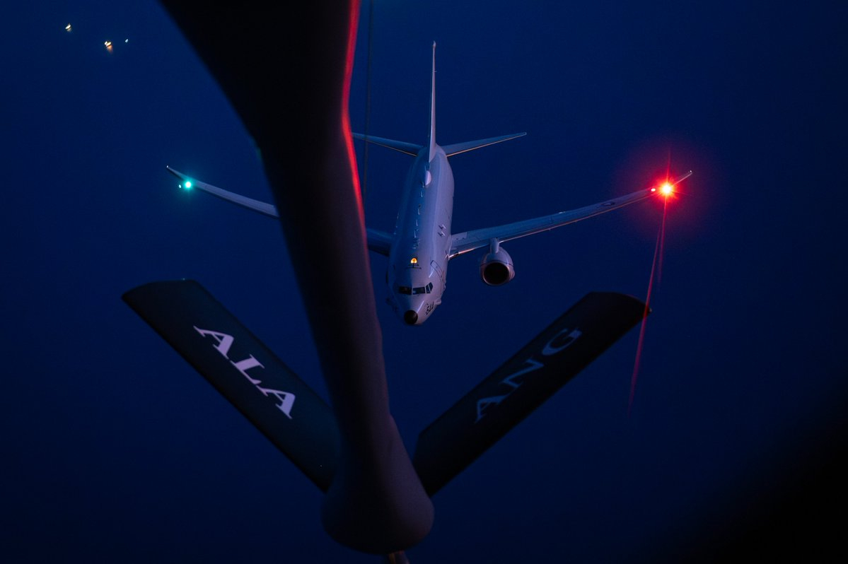 夜色下接受KC-135空中加油支援的P-8 Poseidon