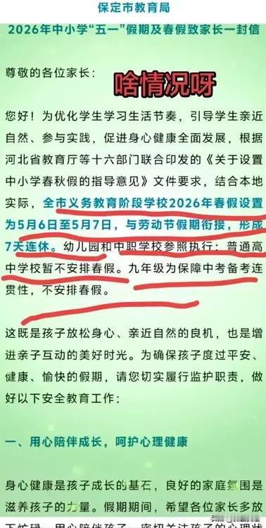 看网友发视频说,保定全市义务教育阶段学校5.15天+5月6日至5月7日2天,形成7天连休。普通高中学校暂不安排春假,九年级不安排春假。
