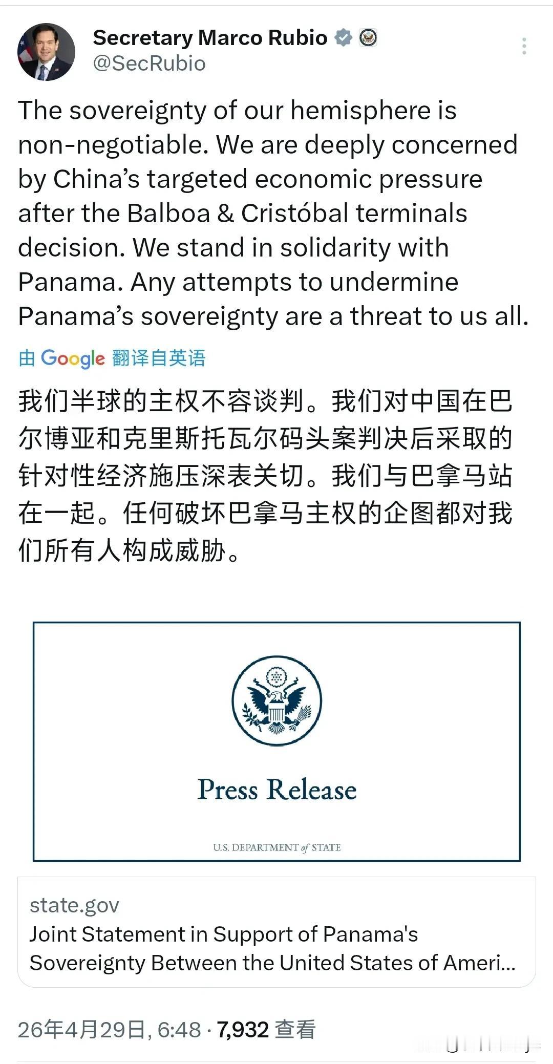 美国国务卿鲁比奥当地时间4月28日)发文写道:“我们半球的主权不容谈判。我们对中国在巴尔博亚和克里斯托瓦尔码头案判决后采取的针对性经济施压深表关切。我们与巴拿马站在一起。任何破坏巴拿马主权的企图都对我们所有人构成威胁。”