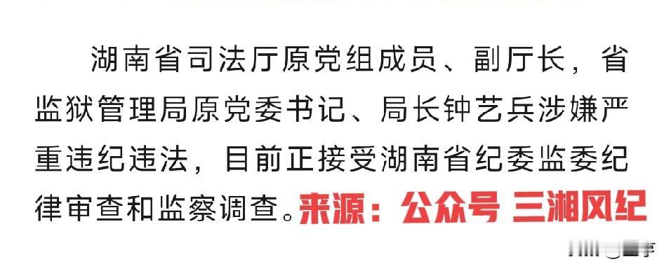 2026年4月29日,中央纪委国家监委网站发布通报。湖南省司法厅原党组成员、副厅长,省监狱管理局原党委书记、局长钟艺兵涉嫌严重违纪违法,接受湖南省纪委监委纪律审查和监察调查。