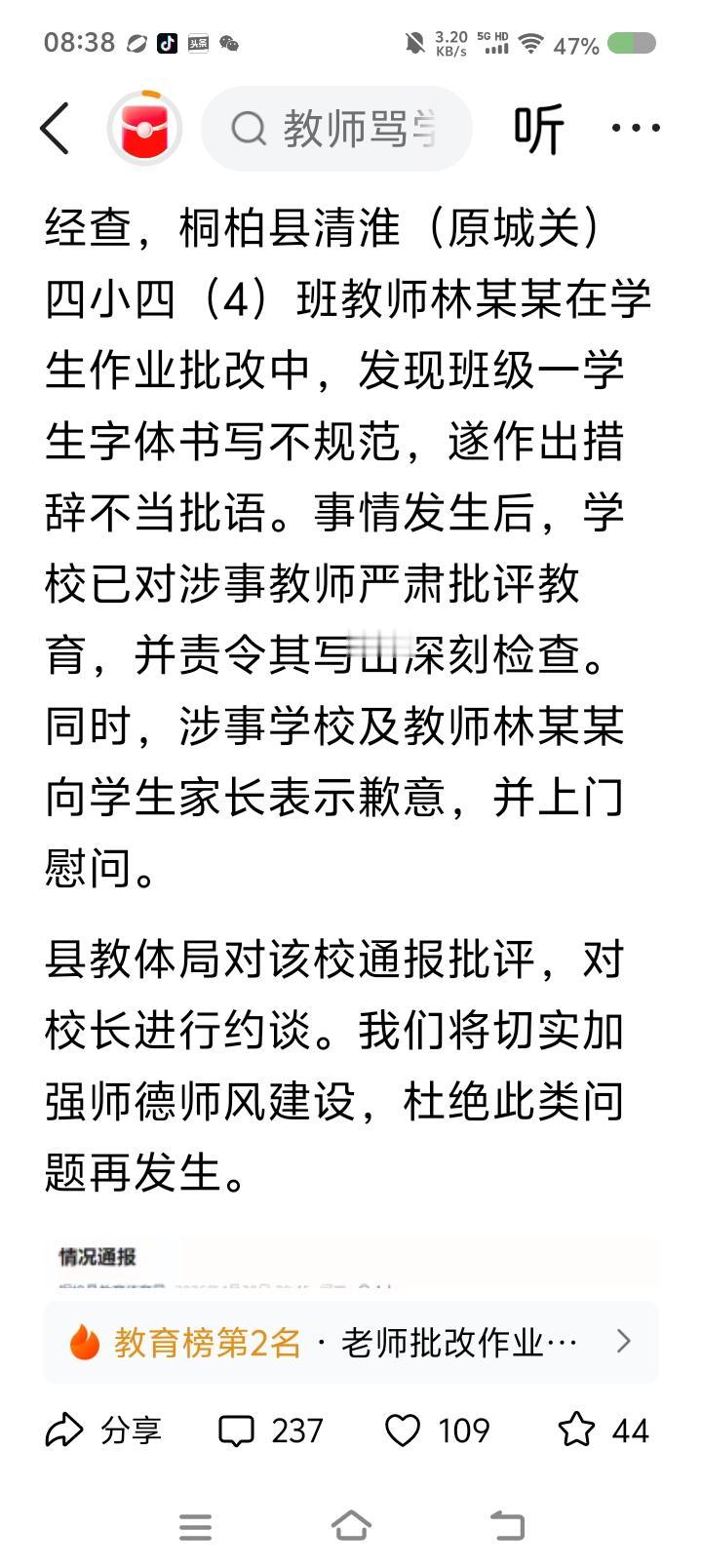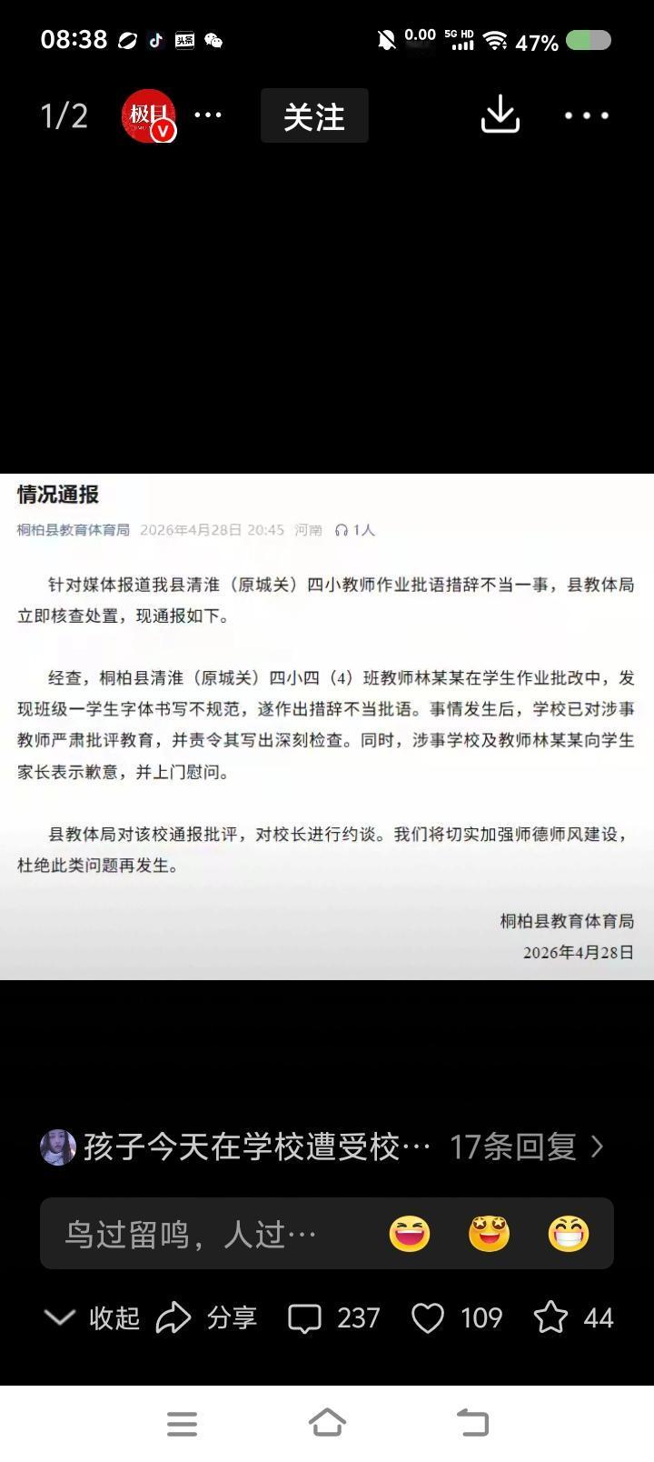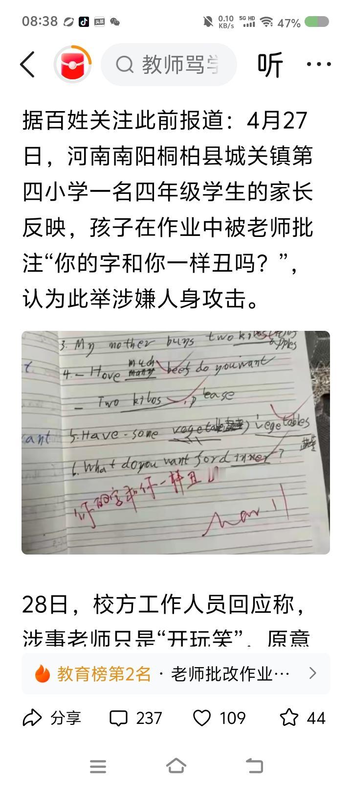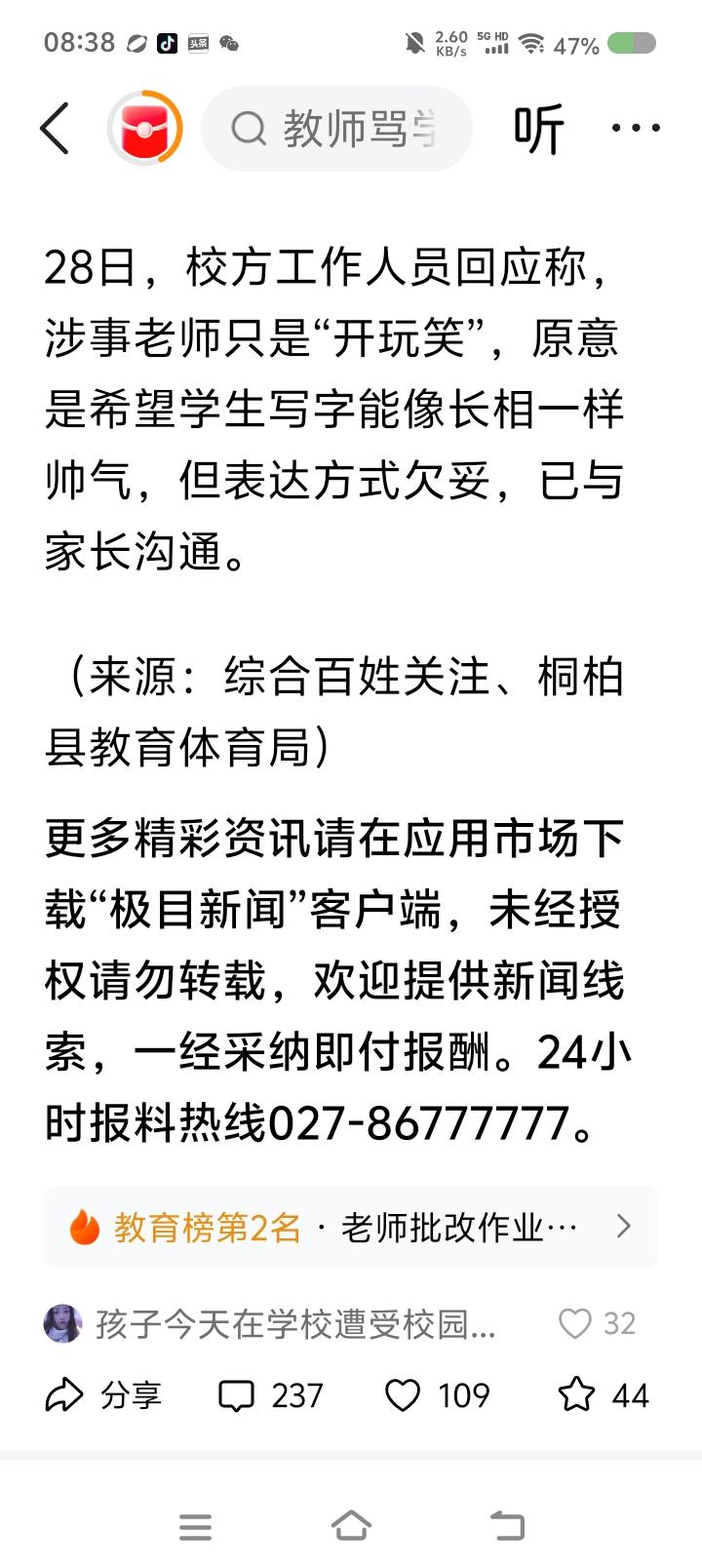 该教师已道歉,并上门慰问该学生。学校工作人员回应:“本来是开玩笑,希望字和人一样帅气。”