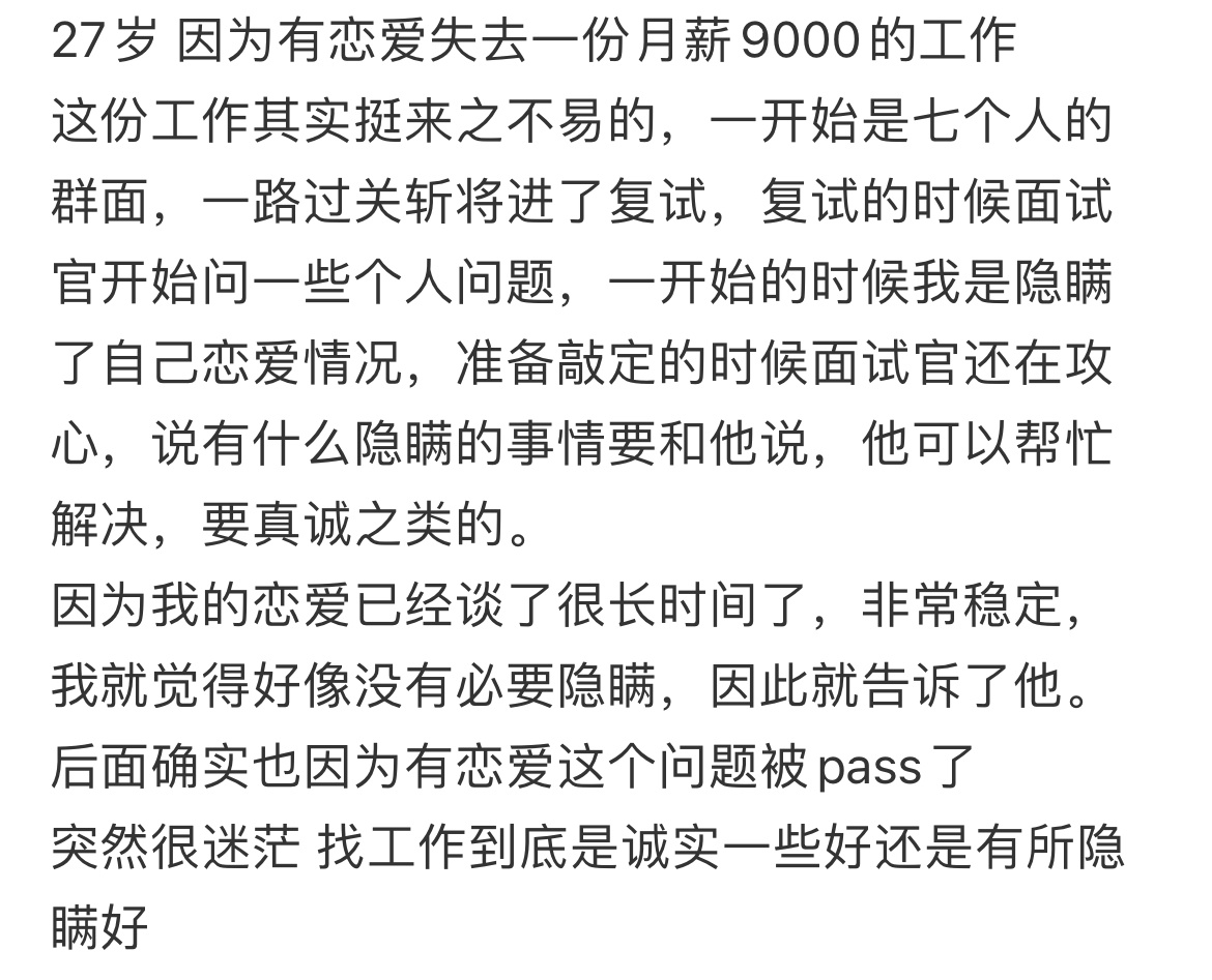 27岁 因为有恋爱失去一份月薪9000的工作