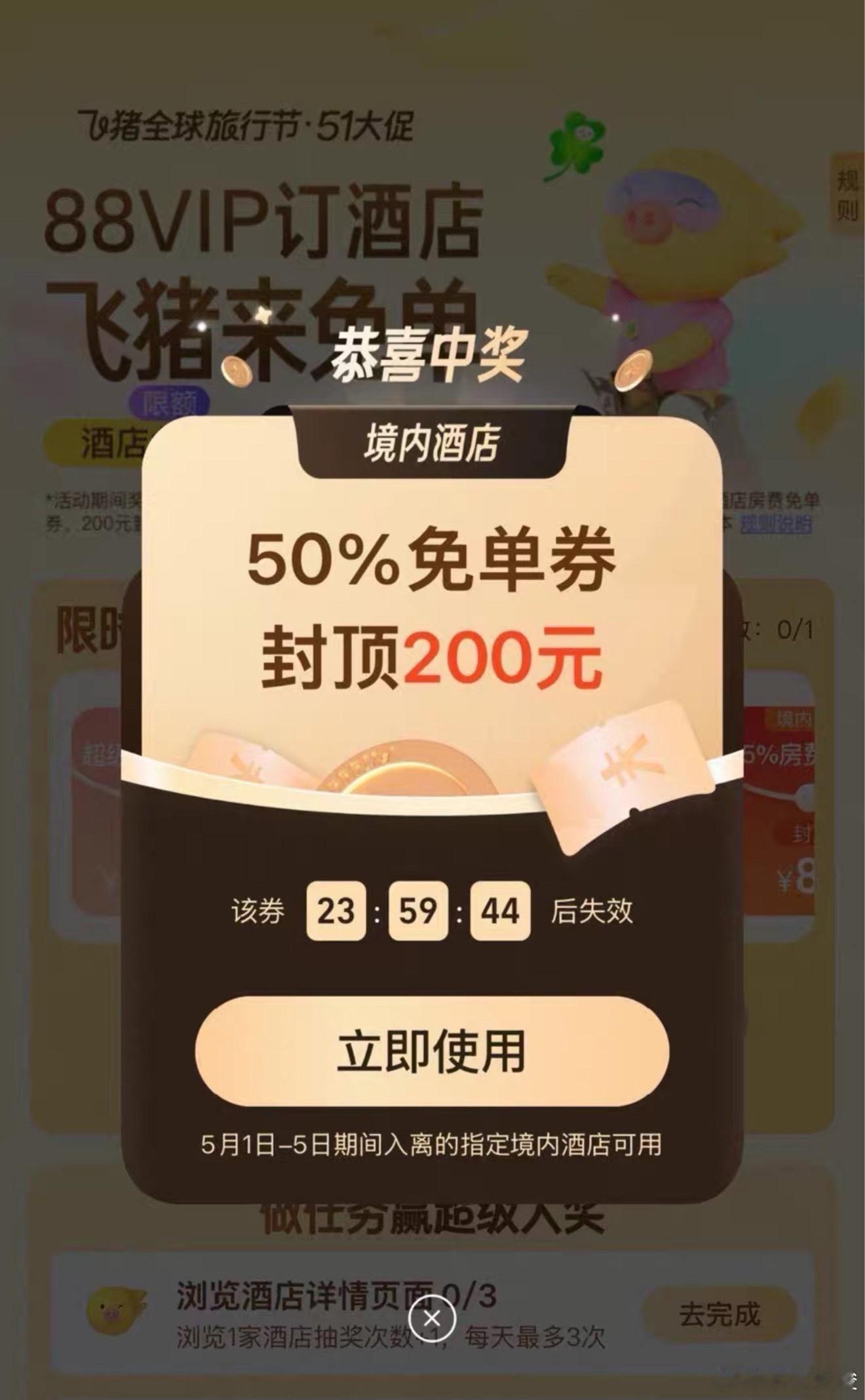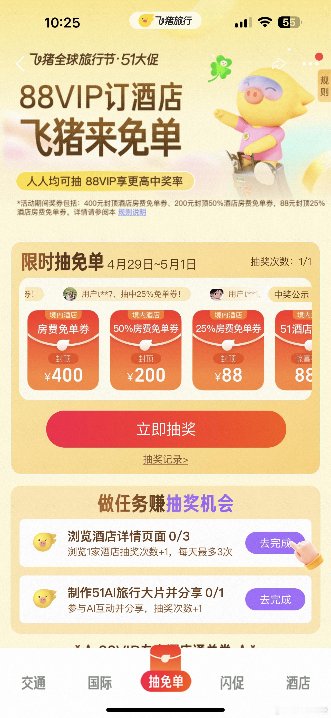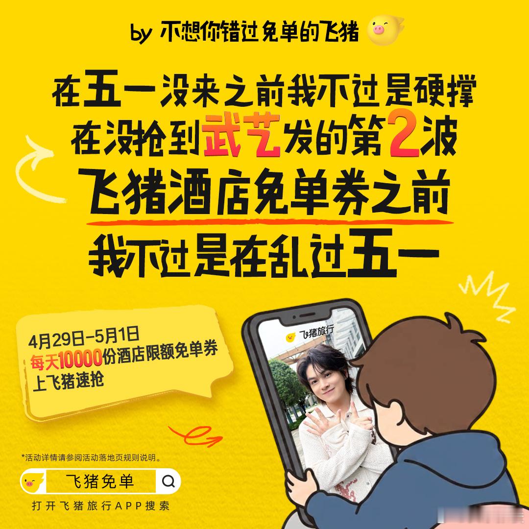 飞猪免单加码 后天就是五一小长假了,不会还有人不知道怎么飞猪免单吧?错过了第一波也别急,第二波飞猪免单加码来了!步骤非常简单,打开飞猪旅行APP,搜索【飞猪免单】4个字就能进入活动页面,每个人在4月29日到5月1日三天时间内,最多有11次抽奖机会。我抽了个50%免单券,正好去景德镇旅游的时候能用上,你也赶紧去试试运气吧!