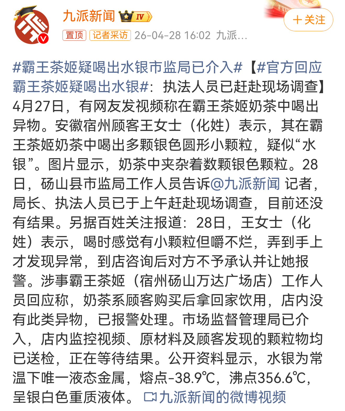 霸王茶姬疑喝出水银市监局已介入这标题有点吓人,但嚼不烂这点来说感觉不太可能是水银,等个后续吧。