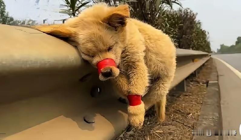 男子把流浪狗捆在路中间的栏杆上,还把它的嘴巴用胶布封起来,可怜的小狗已经放弃了挣
