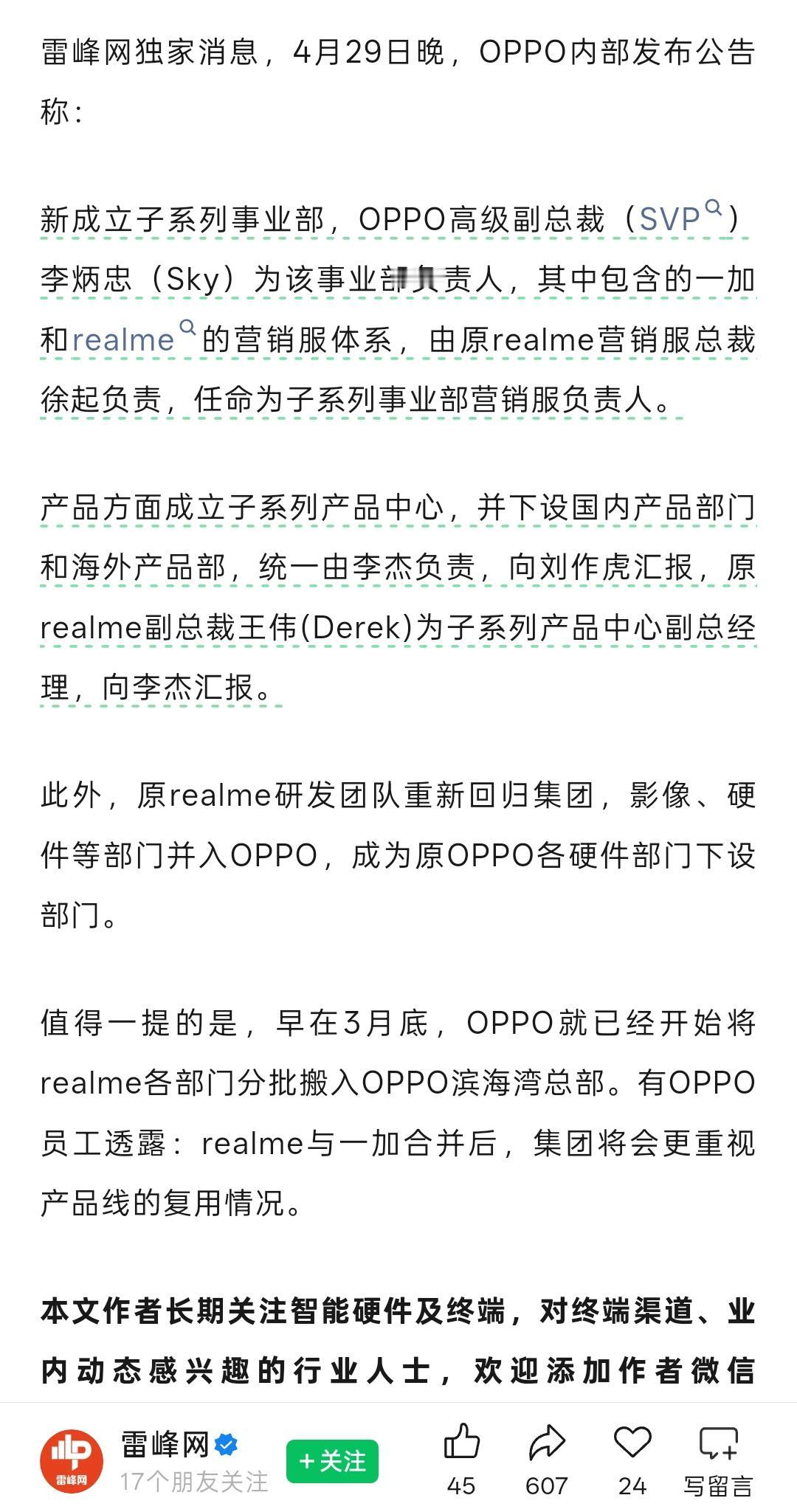 OPPO内部公告,成立子系列事业部,OPPO高级副总裁李炳忠任负责人,整合一加、realme相关体系,徐起分掌营销服体系,李杰分管子系列产品中心。