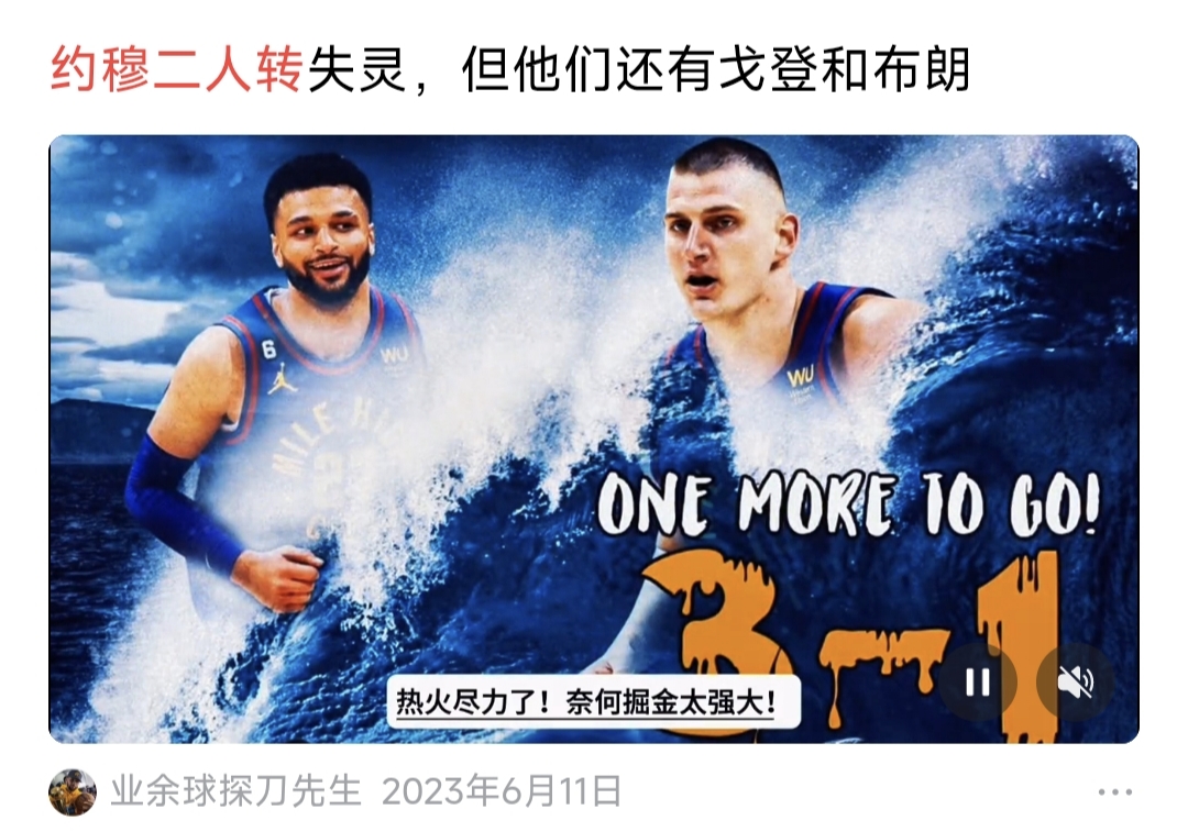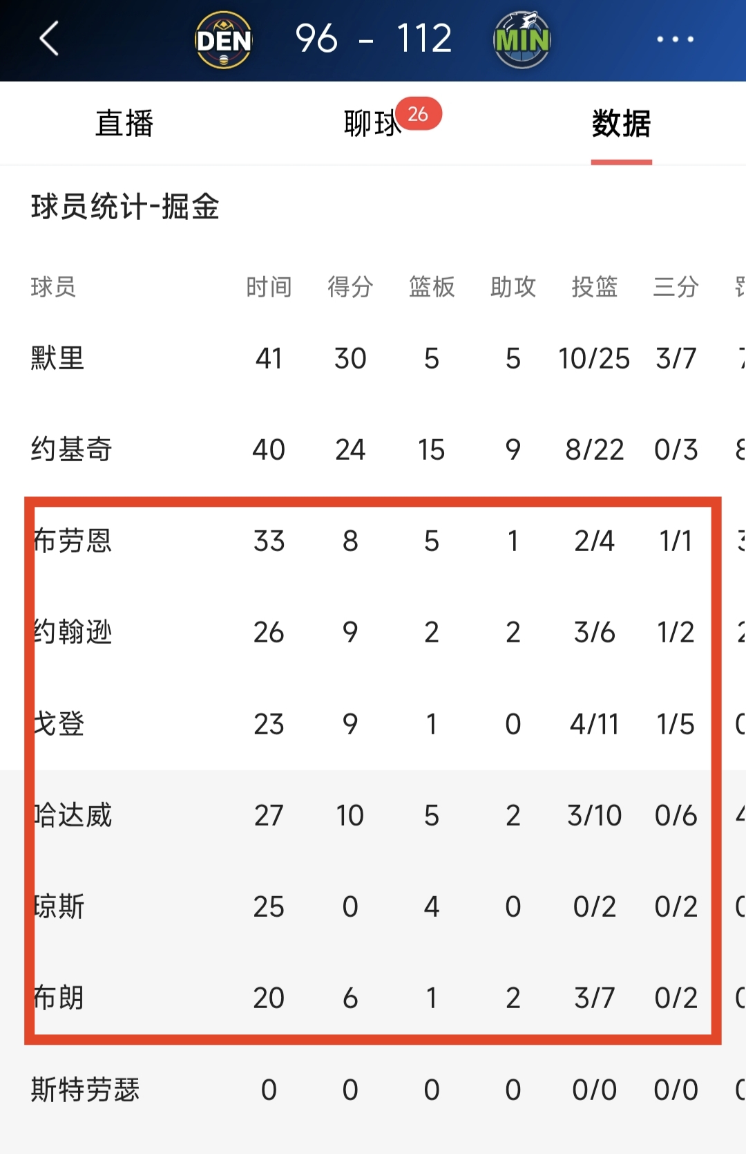 96比112,掘金队被狼逼近悬崖。但这样的掘金队怎么跟狼去拼?现在看丹佛掘金的比赛,在戈登受伤之后,觉得这支队伍除了约基奇和穆雷的约穆二人转攻城拔寨以外,其他几个队员都是看客,打球畏畏缩缩,没有信心也没有冲击力,把所有希望都放在约基奇和穆雷身上,这还打个鬼啊。看看掘金其他球员惨不忍睹的数据,布劳恩8分,约翰逊9分,琼斯0分,布朗9分,就小哈达威勉强上了10分。而且这支队伍目前没有尖兵没有奇兵,就算累死约基奇和穆雷,也打不过森林狼。