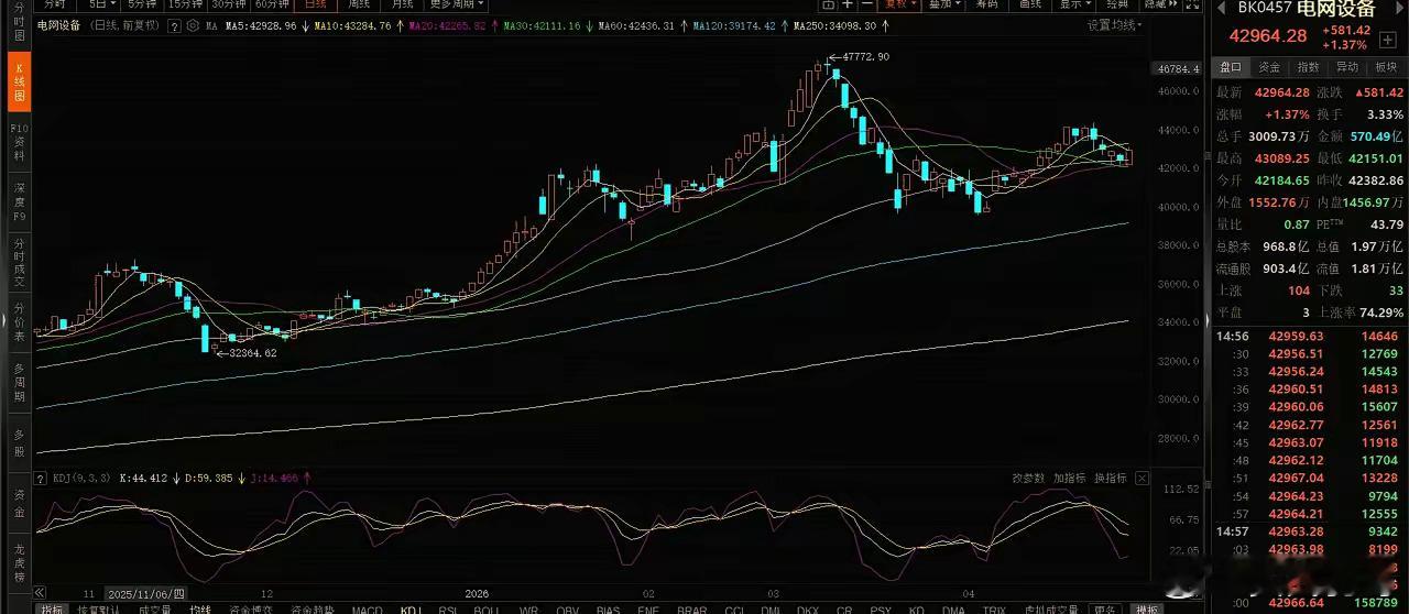 持续调整,航天、人形机器人、电网设备走势分析1、电网设备。站上30日均线后开始调整,今天是调整的第9天。收了一根小阳线,站上了5天均线,但是10日均线还是向下的,低吸没问题,但是仓位还不宜过重。30日均线已经走平了,站上10天均线再震荡下,基本均线就会形成多头了。均线形成多头,新一轮上涨就可以开始了。保持耐心。2、卫星etf。卫星和大盘其实一样的,他主要是围绕60日均线做震荡,60日均线比30日均线更大一些,想要形成多头,需要时间就需要更久一点。从这个角度来看,电网设备行情应该会比卫星etf来的更快一些。卫星就看啥时候重新站上5天均线了,重新站上来调整就基本结束了。3、人形机器人。也是围绕60日均线震荡,突破60日均线开始回调,也是调整了6天左右。只是调整幅度比大盘更大一些,今天上涨暂时还不能判定这里调整已经结束,再耐心等等,有一个好现象是30日均线已经拐头向上了,只要不跌破30日均线,这里所有调整都是良性调整,都是为后续第二波上涨做准备。